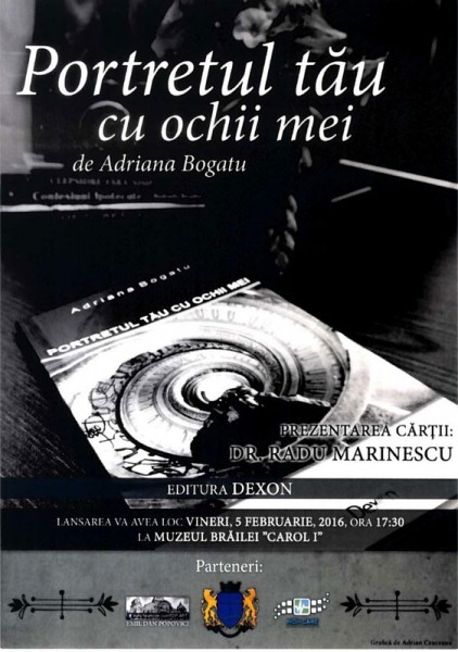 Vineri, 5 februarie, la ora 17.30, în sala de festivităţi a Muzeului Brăilei "Carol I" (Piaţa Traian, nr. 3), va avea loc lansarea volumului "Portretul tău cu ochii mei" de Adriana Bogatu, apărut la Editura Dexon.