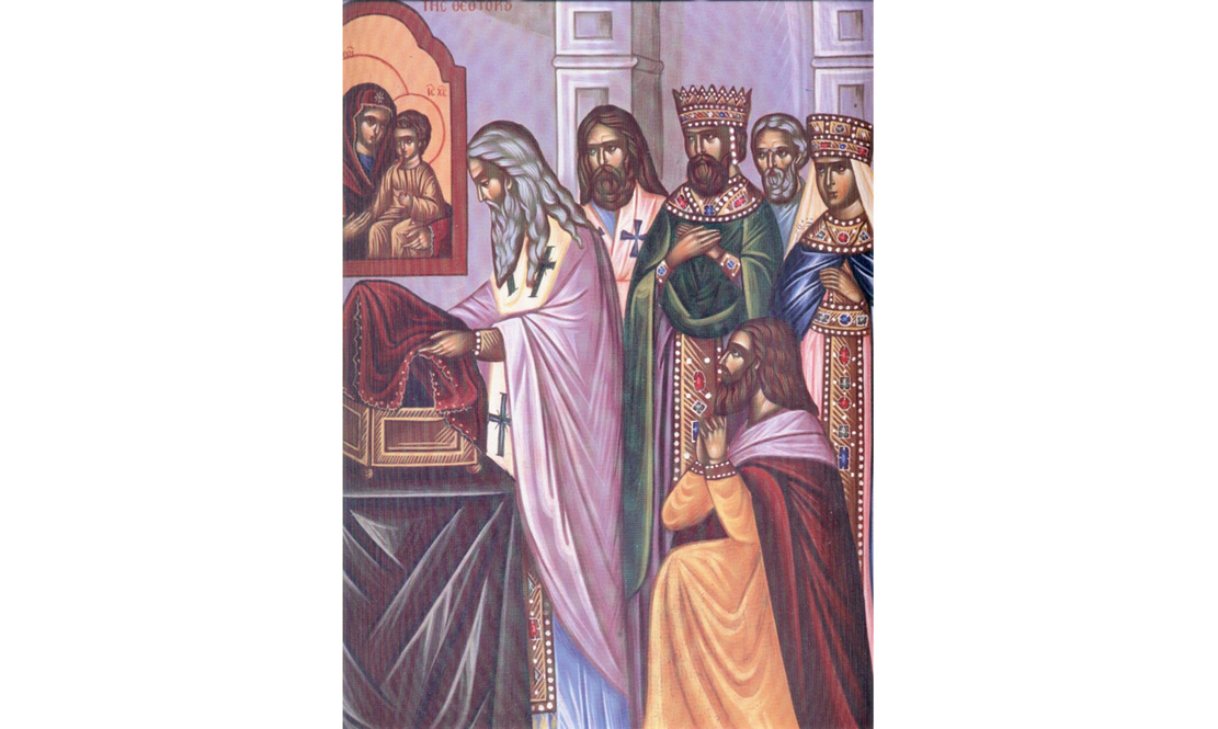 “Punerea Cinstitului Vestmânt al Maicii Domnului în Mănăstirea Vlaherne, Cetatea care te cinsteşte pe tine şi după datorie te slăveşte, o acoperi, Prealăudată, cu cinstitul tău vestmânt şi o izbăveşti pe ea de năvălirea celor fără Dumnezeu, de foamete, de cutremur şi de războiul cel dintre noi totdeauna, Fecioară, ceea ce eşti neispitită de nuntă. Pentru aceasta, te slăveşte pe tine, preasfântă dumnezeiască Mireasă, ajutătoarea oamenilor!”