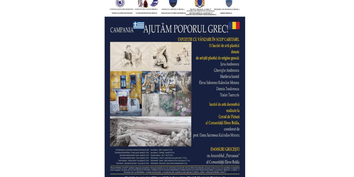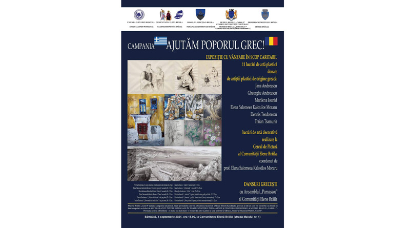 Comunitatea Elenă Brăila, în colaborare cu Muzeul Brăilei "Carol I", Uniunea Elenă din România, Consiliul Județean și Primăria Municipiului Brăila organizează sâmbătă, 4 septembrie, ora 18.00, la sediul din Strada Malului nr. 1 al Comunității, un eveniment caritabil în cadrul campaniei umanitare "Ajutăm poporul grec!", inițiată de Uniunea Elenă din România, în urma catastrofalelor incendii care au devastat pădurile, insulele, siturile arheologice, orașele și satele grecești.