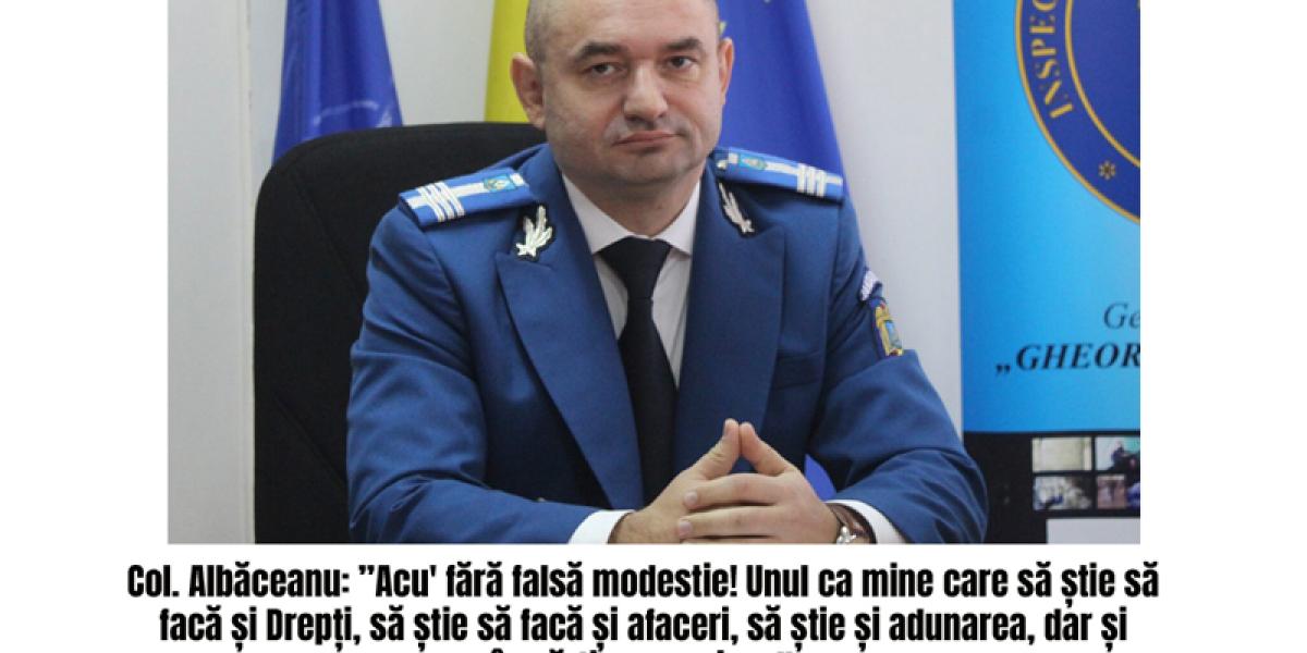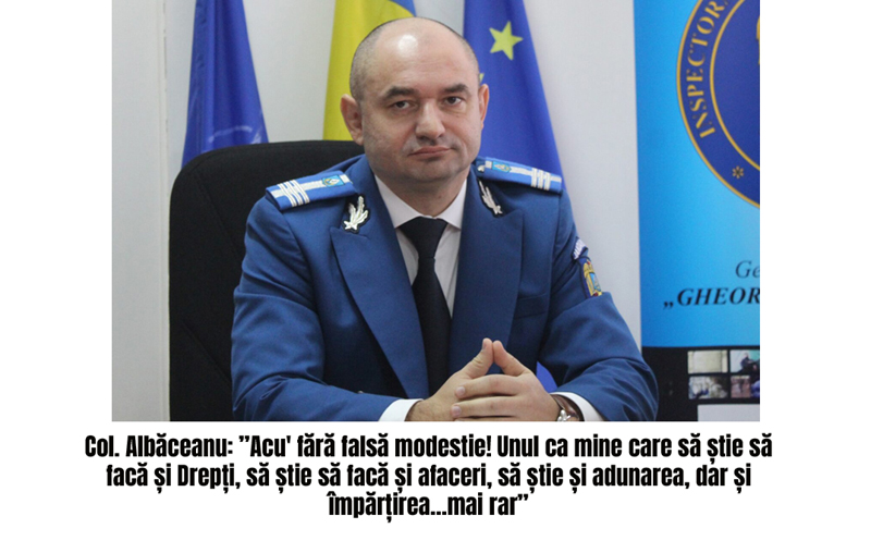 Noi, ăștia de la Scormonitoru, am avut dreptate ! Noi am zis încă de pe 13 iunie că colonelul Albăceanu (scuzați cacofonia!) corectul, cinstitul, profesionistul, premiatul pe la toate galele de excelență, nu poate fi DECÂT nevinovat. DNA-ul ăsta lucrează la comandă politică, ce mai ! ”Sigur e o făcătură politică! Sigur binomul Coldea – Kovesi e de vină! Sau PSD-ul? Nu-i așa domnu' Popa, că PSD-ul e vinovat?”, scriam noi în articolul ”Jandarmul și DNA-iștii”. Iată că am avut dreptate! Din inculpat percheziționat, acuzat de infracțiuni nașpa, pus sub control judiciar, dat jos din funcție, iată că a ajuns din nou jandarmul-șef al județului Brăila! Asta înseamnă justiție! Asta înseamnă respectarea prezumției de nevinovăție. Nu ce-au scris ăștia de la DNA în iunie a.c, cităm: