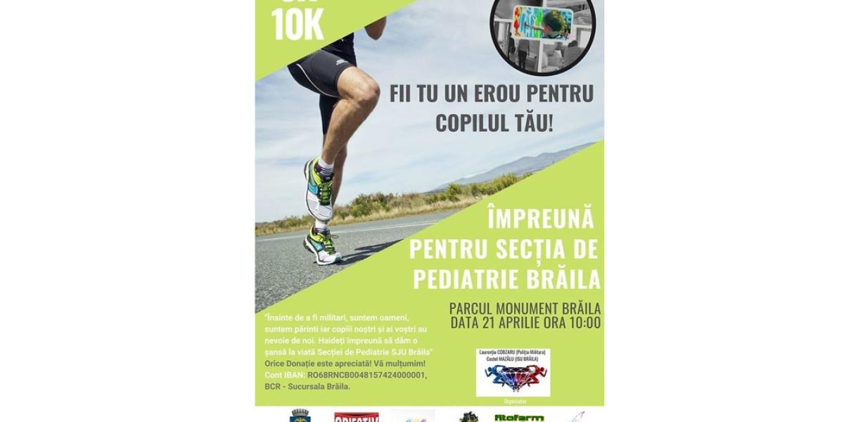 La iniţiativa militarilor Laurenţiu Cobzaru (Poliţia Militară, MApN) şi Costel Mazâlu (ISU Brăila, MAI), cotidianul “Obiectiv-Vocea Brăilei” şi Asociaţia “Pentru Adevăr”cu sprijinul Primăriei Municipiului Brăila organizează evenimentul sportiv “Fii tu un erou pentru copilul tău!” în cadrul campaniei “#coloramimpreuna. Dăm viaţă secţiei de Pediatrie!”. Cross-ul va începe la ora 10.00 şi se va alerga pe distanţe de 5.000 de metri (5 kilometri) şi 10.000 de metri (10 kilometri).