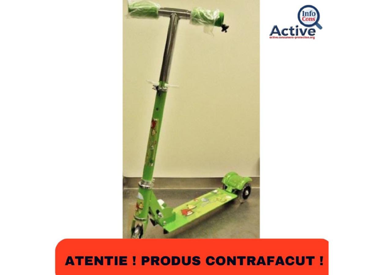 Trotineta de jucărie aparent inofensivă, cu trei roți, una în față, două în spate, oferită în cutie de carton, este un alt produs contrafăcut și periculos. Roata din față este prea mică, spun specialiștii, și se poate bloca cu ușurință în momentul în care intră într-o adâncitură din pământ. „Acest lucru poate face ca copilul să cadă și să sufere răni. Totodată, capetele ghidonului sunt prea mici. Dacă un copil cade peste ele, acest lucru poate provoca răni din cauza puncției în abdomen. În plus, produsul conține avertismente și informații insuficiente pentru utilizatori și nu respectă cerințele Directivei privind siguranța jucăriilor și standardului european relevant EN 71-1”, precizează InfoCons.