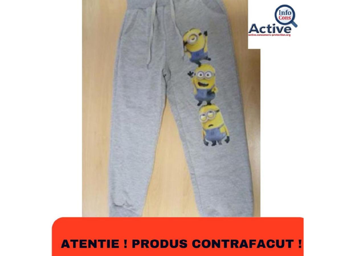 Pantalonii gri, cu imagini cu personaje de desene animate, destinați copiilor de 3-8 ani, este următorul produs contrafăcut prezentat ca fiind unul periculos. Șnururile din zona taliei sunt prea lungi și pot rămâne prinse în timpul diferitelor activități ale copilului. Produsul nu respectă standardul european relevant EN 14682.