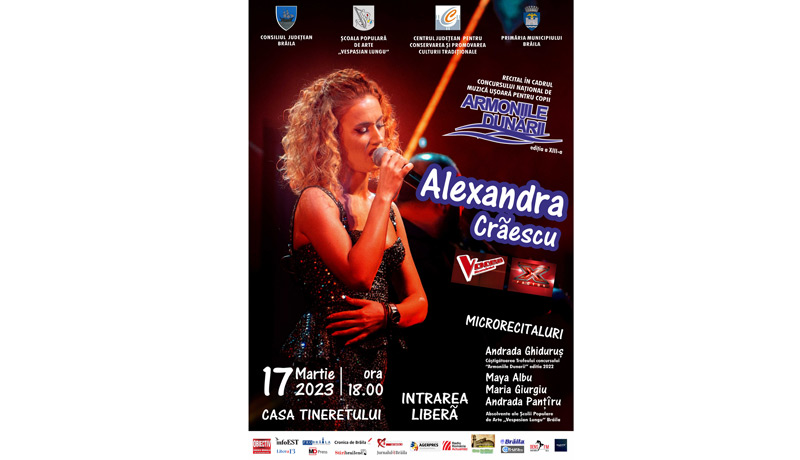 „Vă invităm vineri, 17 martie 2023, începând cu ora 18.00, în Sala de spectacole a Casei Tineretului din Brăila, la recitalul susținut de solista Alexandra Crăescu, cu prilejul celei de-a XIII‑a ediții a Concursului Național de Muzică Ușoară pentru Copii „Armoniile Dunării”, în cadrul căruia puteți asista, încă de la ora 10.00, la competiția în care vor intra tineri cu vârste cuprinse între 7 și 18 ani, originari din mai multe zone ale țării”, precizează, într-un comunicat, organizatorii manifestării.