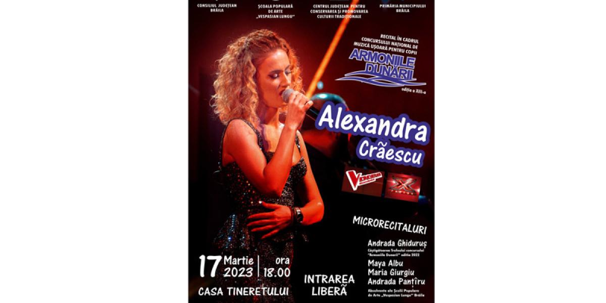Cunoscuta interpretă de muzică ușoară Alexandra Crăescu va concerta, pe 17 martie 2023, la cea de-a XIII‑a ediție a Concursului Național de Muzică Ușoară pentru Copii „Armoniile Dunării”, de la Brăila.