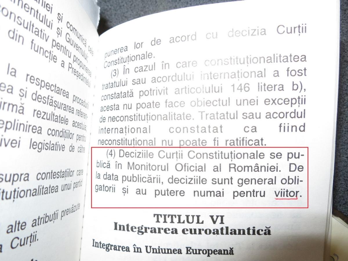 “Conform articolului 147 legat de deciziile Curții Constituționale, la aliniatul 4, se subliniază clar în Constituția României: «Deciziile Curții Constituționale se publică în Monitorul Oficial al României. De la data publicării deciziile sunt general obligatorii și au putere numai pentru viitor». Cu alte cuvinte, deciziile Curții Constituționale privind revocarea procurorului general adjunct, șeful DNA, nu se încadrează în acest articol. În sensul că, așa cum spune la aliniatul 4, o astfel de decizie are putere numai pentru viitor. Adică pentru procurorul actual nu are niciun efect. Viitorul procuror general adjunct, șeful DNA-ului poate fi supus deciziei Curții Constituționale. Cu alte cuvinte, degeaba spun PSD-iștii să o schimbe pe persoana actuală - nu vorbesc despre cine e vorba, putea să fie oricine, nu are importanță -, atât timp cât deciziile CCR sunt «pentru viitor». E foarte clar! Ei nu pot lua o decizie pentru prezent ci pentru viitor. Am văzut că sunt unii postaci care vorbesc fără să vadă textul Constituției. Să citească exact ce scrie acolo!”, a afirmat Alexandru, revoltat.
