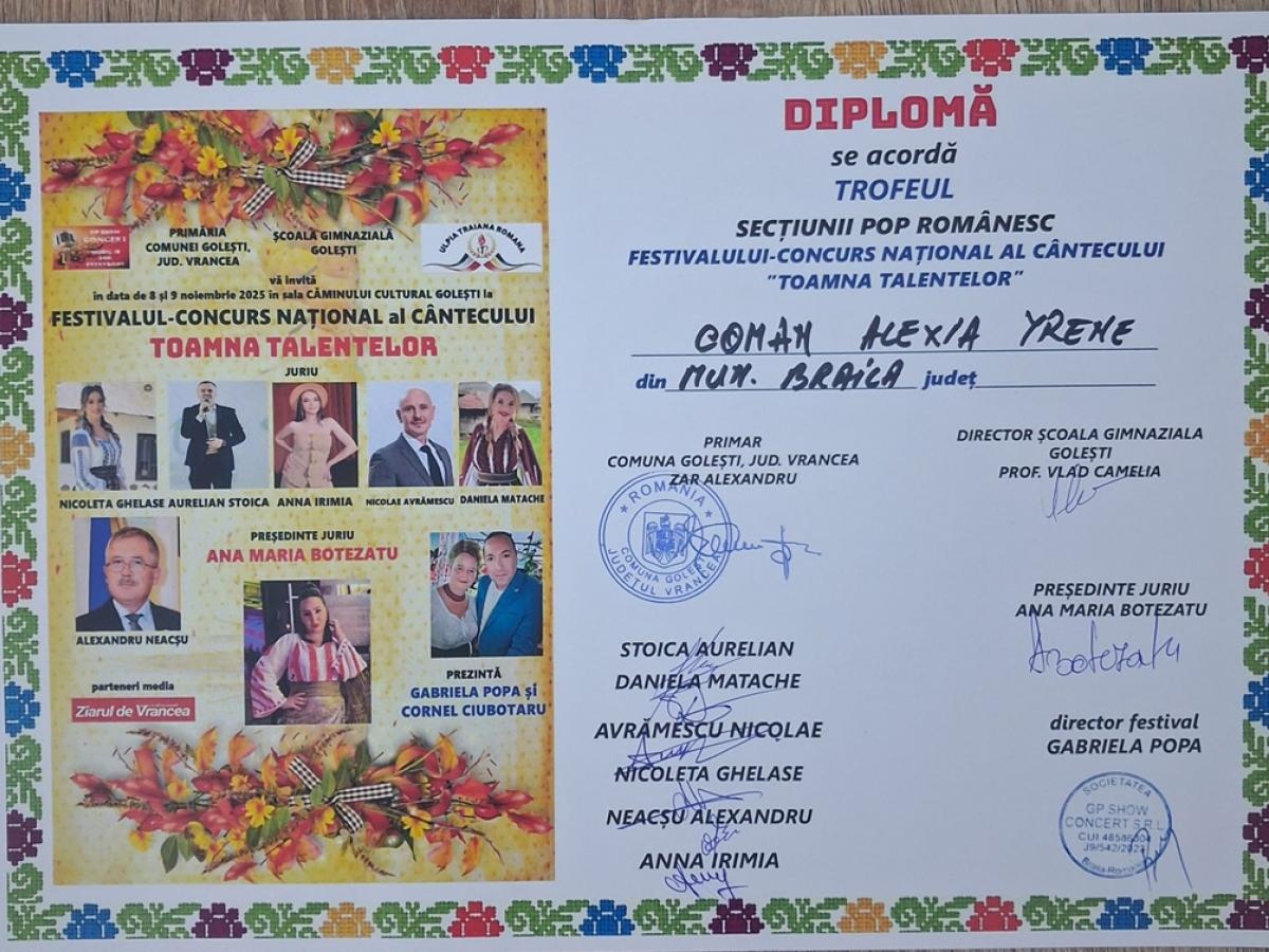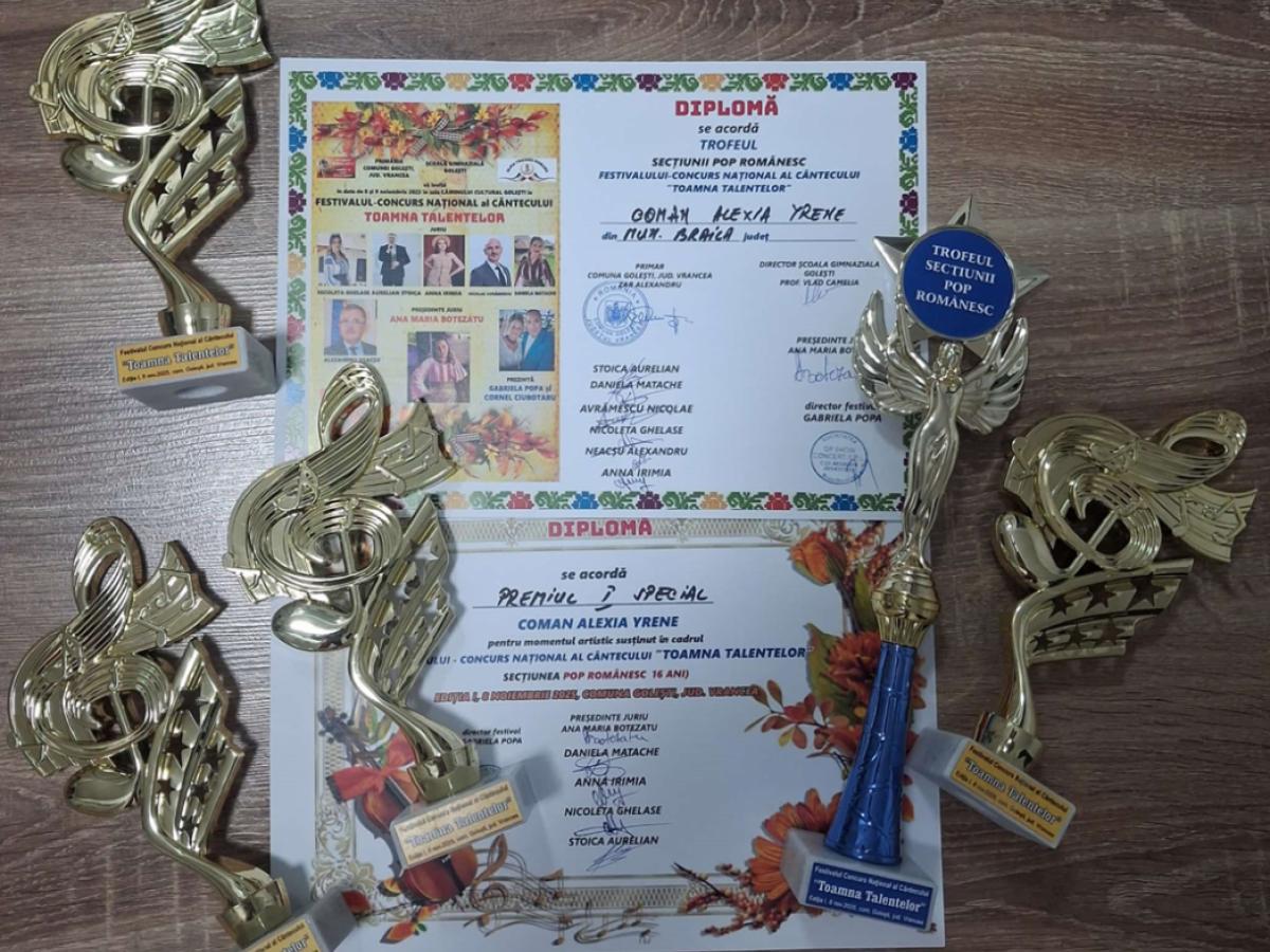 Copiii și adolescenții Brăilei continuă să facă cinste orașului în care au văzut lumina zilei și să-i uimească pe toți cu talentul lor. Deținătoare a peste 100 de premii și trofee, câștigate cu muncă și sudoare, Alexia Yrene Coman, elevă în clasa a X-a la Colegiul Național Pedagogic „Dumitru Panaitescu Perpessicius” Brăila, și-a adăugat în palmares alte trei Premii I și un Trofeu, câștigate la cea dintâi ediție a Festivalului-Concurs Național al Cântecului „Toamna Talentelor”, organizat, în zilele de 8 și 9 noiembrie 2025, de Gabriela Popa, în colaborare cu interpreta Ana Maria Botezatu - eveniment susținut de Primăria Comunei Golești, județul Vrancea.