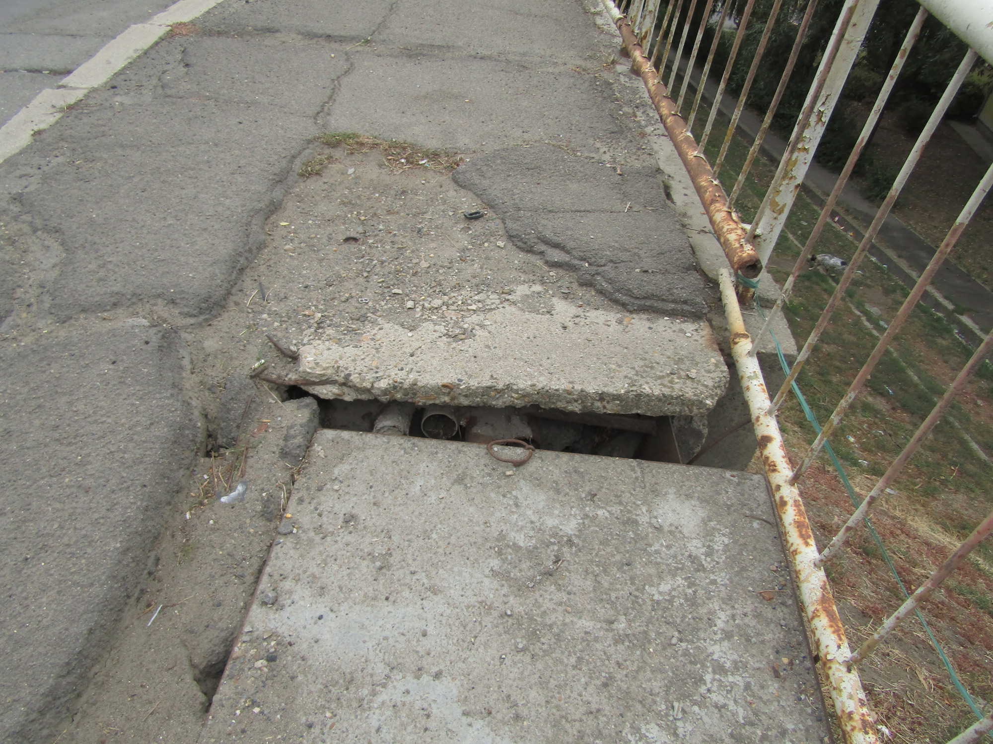 La rampa de acces pe pod, spre Chercea, nu se știe de ce, pe mai bine de 50 de metri lipsește balustrada din tablă groasă, profilată și oțeloasă, din marginea carosabilului. Ori nu s-a montat, ori a fost furată (dovadă că, deunăzi, s-a aplicat o sudură zdravănă, la capătul tronsonului). Sub pod, în zona “pieței de ruși“, taluzul este afectat de furtul dalelor din beton, iar în zona căii ferate, de sub plăcile din beton de la baza podului și prin dizlocarea unor grinzi s-a furat pământ galben, probabil de către cineva care a avut nevoie să-și facă chirpici. Intemperiile au accentuat și ele acest aspect, prin spălarea loesului.