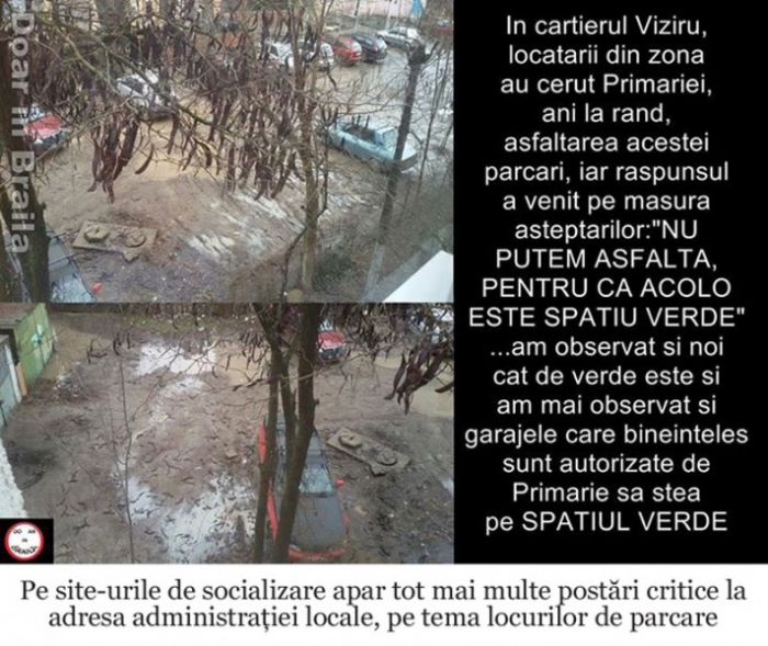 Dincolo de explicaţiile oferite de Primărie, brăilenii s-au săturat să solicite în van amenajarea de parcări lângă blocurile unde locuiesc. De exemplu, un locatar de pe Aleea Culturii, din cartierul Viziru, spune că a trimis nenumărate sesizări către municipalitate, în care solicită ca un teren viran dintre blocurile 10 şi 16 de pe strada respectivă, să fie asfaltat, în aşa fel încât acolo să poată fi ţinute în condiţii decente maşinile riveranilor. "Ni s-a răspuns că nu se poate face parcare deoarece terenul figurează ca spaţiu verde. Am observat şi noi cât de verde este..." a scris brăileanul, ironic, pe un site de socializare, unde a postat câteva poze din care reiese că ceea ce Primăria numeşte "spaţiu verde" este, de fapt, doar un petec de pământ neamenajat în niciun fel, care, pe timp ploios, se umple de bălţi şi noroi. În plus, după cum remarcă autorul postării, terenul respectiv este ocupat de o mulţime de garaje de beton, în loc să fie amenajat corespunzător, pentru a putea găzdui cât mai multe autoturisme ale locatarilor zonei.