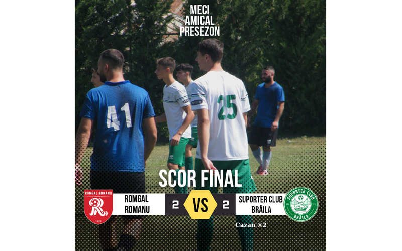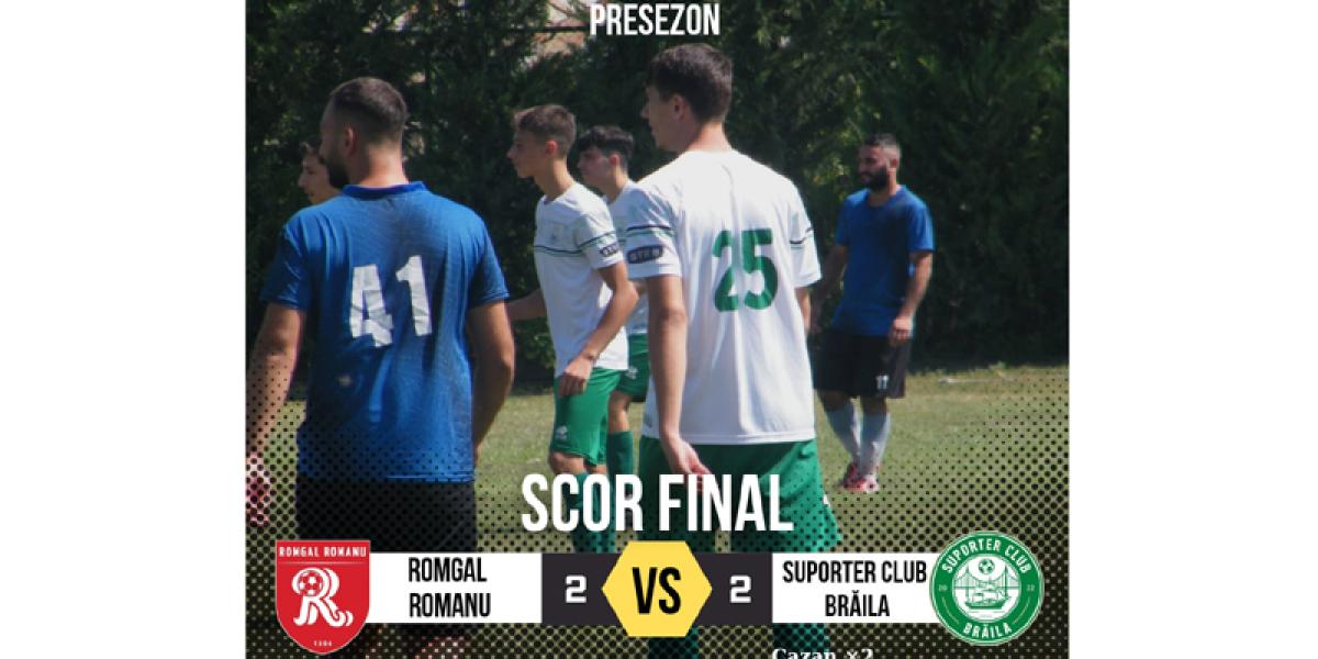 Romgal Romanu, locul al 5-lea în Seria I a Ligii a V-a în ediția anterioară a remizat 2-2, într-un amical disputat sâmbăta trecută cu Suporter Club Brăila, formație care activează în Liga a IV-a.