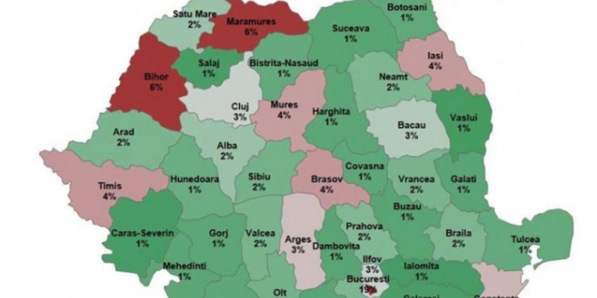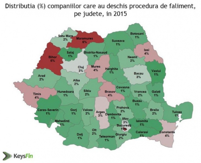 În topul oraşelor, Bucureştiul se află pe primul loc, cu 1.402 firme în faliment, dublu faţă de anul precedent. Pe judeţe, cea mai rea situaţie se regăseşte în Maramureş (428), urmat de Timiş (295), Braşov (294), Iaşi (288), Mureş (286), Constanţa (260) şi Argeş (252). La polul opus s-au situat judeţele Vaslui (38), Caraş Severin (44), Ialomiţa (44), Sălaj (48), Călăraşi (50). "Cele mai multe falimente sunt în Bucureşti pentru că şi numărul firmelor este mai mare. De altfel, cu cât business-ul este mai dezvoltat, cu atât şi riscurile de insolvenţe şi falimente sunt mai mari. Situaţia din Vaslui, Caraş Severin şi Ialomiţa nu înseamnă că în aceste zone este un vad economic excelent, ci că afacerile sunt mai puţine decât în alte locuri", au explicat analiştii.