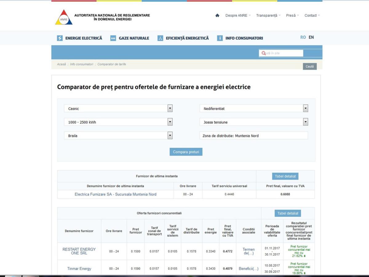 Ca şi în cazul modulului pentru gaze naturale, cei de la ANRE au pus la dispoziţie, pe pagina proprie web, şi un “Comparator de preţ pentru ofertele de furnizare a energiei electrice”. Pentru a vă face o idee despre ofertele disponibile, trebuie să alegeţi în criteriile de căutare caracteristicile consumatorului casnic cu un consum anual sub 1.000 kWh, adică un consum mediu lunar undeva la 83 kWh, cu o factură de circa 51 lei/lună (preţul fostului RENEL 608,8 lei/MWh).
