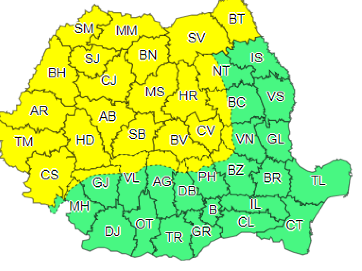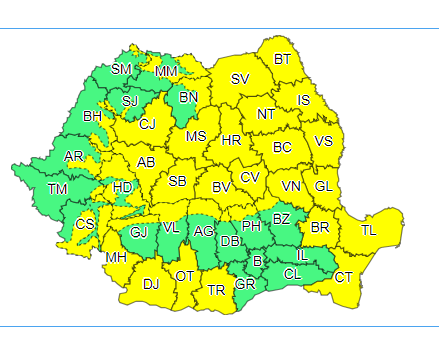 ANM a emis şi un cod galben de vânt puternic, valabil mâine, între orele 2 şi 10.00. Zonele afectate: Banat, Crişana, Maramureş, Transilvania, nordul Moldovei şi zona montană. În regiunile vizate, vântul se va intensifica temporar, cu viteze de 55...65 km/h, iar pentru intervale scurte de timp vor fi rafale de peste 65...70 km/h. În zona montană vor fi intensificări susţinute ale vântului, cu rafale care pe creste vor depăşi 100…120 km/h.