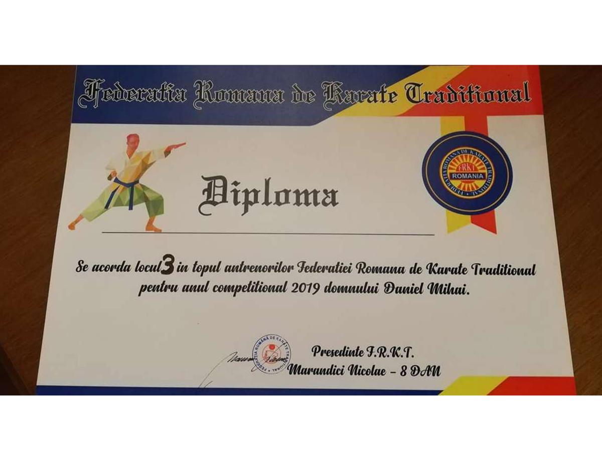 “Am avut un stagiu de pregătire la Poiana Braşov la care au venit toţi antrenorii din ţară, am aflat noile reguli din arbitraj. Au fost în jur de 50 de participanţi. Cu acest prilej am primit şi diploma cu locul al treilea în topul antrenorilor Federaţiei Române de Karate Tradiţional. Ca recompensă pentru rezultatele foarte bune obţinute în concursurile naţionale şi internaţionale în 2019. De asemenea, în decembrie anul trecut au dat examenele şi acum am primit diploma care atestă urcarea în grad, acum am 3 dan. Sunt foarte fericit şi sper ca şi în 2020 să mergem pe aceeaşi linie a performanţelor. Pe 20 februarie încep competiţiile oficiale, primele fiind etapele de zonă ale Campionatelor Naţionale de karate tradiţional unde trebuie să confirmăm că merităm să ajungem să ne luptăm pentru medalii în fazele finale”, ne-a declarat antrenorul Daniel Mihai.