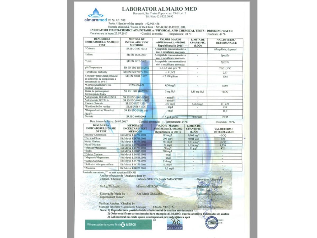 Rezultate alarmante privind apa care curge la robinetele firmei lui Daniel Cîrîc, “SC Agro Daniel SRL”! Omul de afaceri ne-a pus la dispoziţie cele mai recente buletine de analiză a apei de la Însurăţei, eliberate de un laborator privat din Bucureşti, costul analizelor fiind suportat integral de el. Rezultatele au arătat valori şi de opt ori mai mari decât limita maximă admisă prin lege, la mangan. Reprezentanţii laboratului privat au recoltat probe de apă şi de la un locuitor de unde au prelevat probele şi inspectorii de la Direcţia de Sănătate Publică Brăila, la jumătatea lunii iulie.