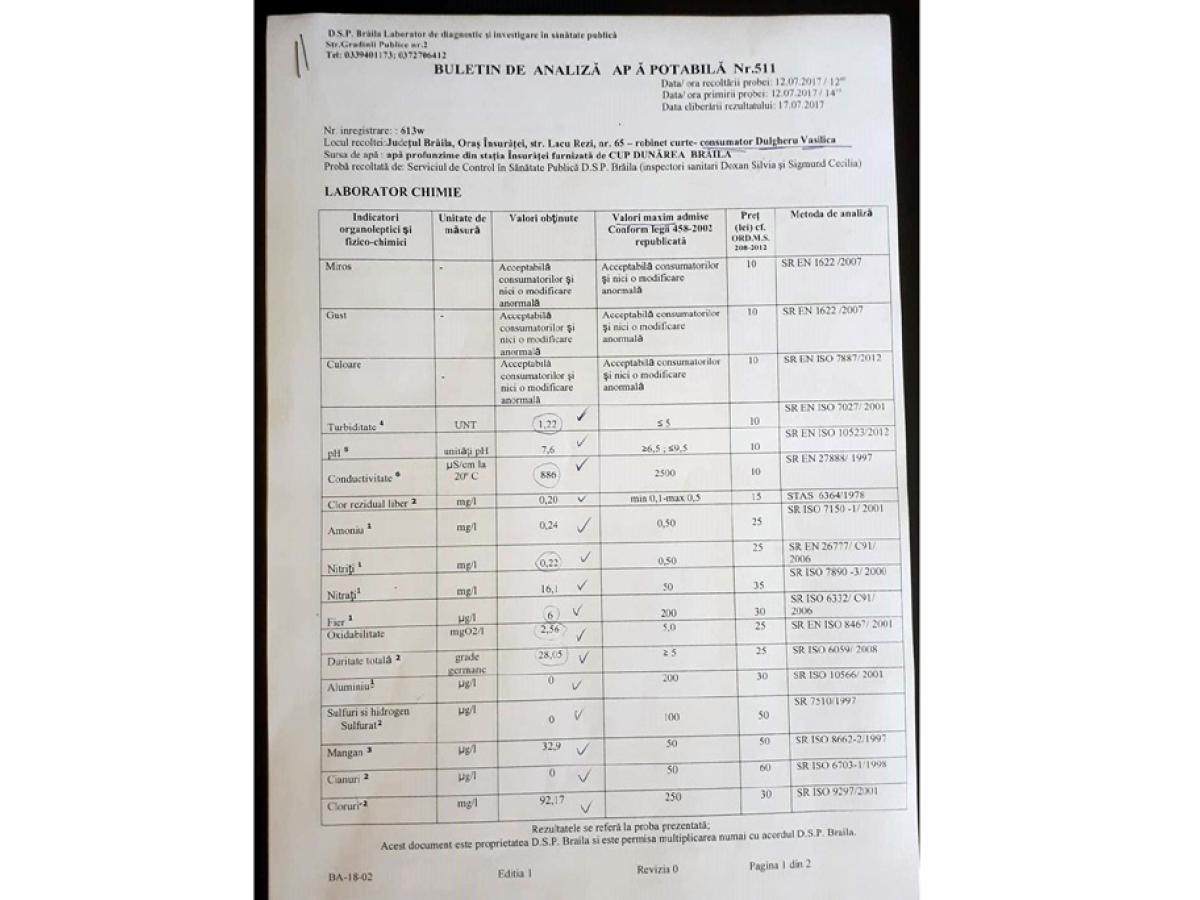 Buletinul de analiză a apei eliberat de laboratul privat din Bucureşti datează din 25 iulie 2017. Rezultatele au arătat că apa pe care o foloseşte firma lui Daniel Cîrîc are valori mai mari decât limita maximă admisă, confirmând suspiciunile afaceristului care ne-a sesizat în repetate rânduri problemele apei potabile de la Însurăţei. Spre exemplu, culoarea apei este “alb gălbuie şi are depuneri”, potrivit buletinului de analiză, lucru surprins şi de Cîrîc în fotografiile pe care ni le-a trimis la redacţie cu ceva timp în urmă. Valoarea fierului din apă este de 339 micrograme/litru, în condiţiile în care limita maximă permisă prin lege este de doar 200 micrograme/litru. Iar în ceea ce priveşte manganul, valoarea acestuia este de peste opt ori mai mare decât maxima acceptată: 432 micrograme/litru în loc de 50 micrograme/litru!