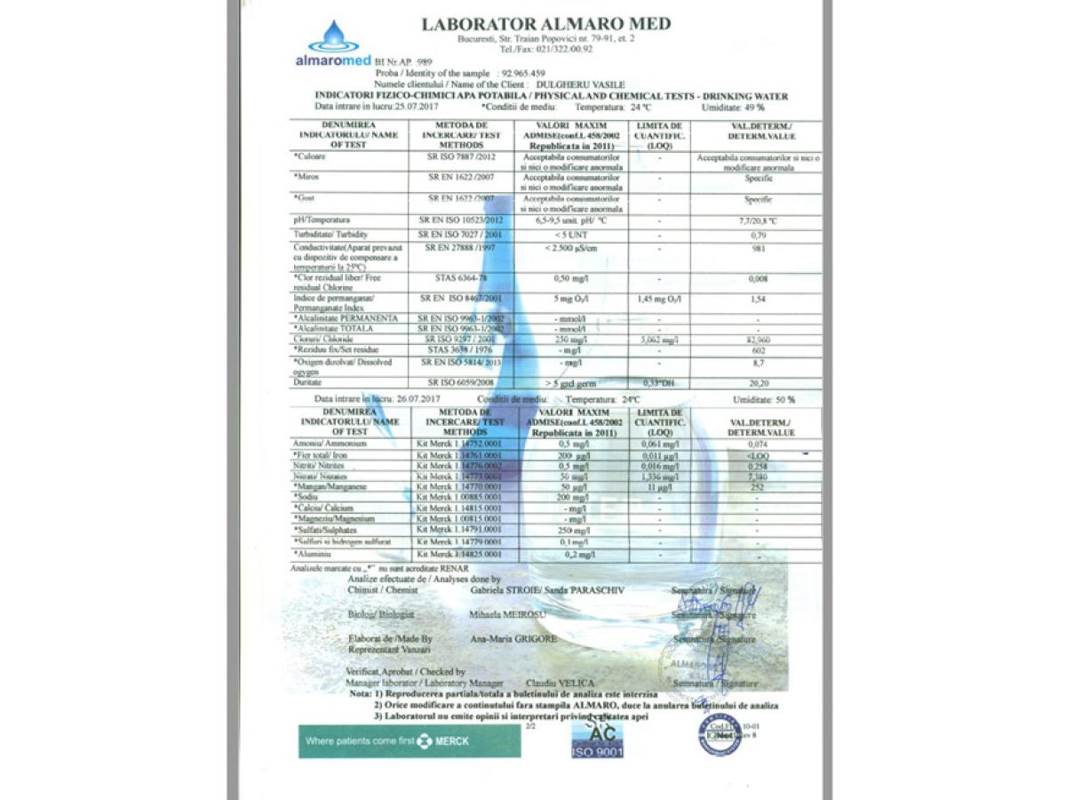 Cei de la laboratorul privat bucureştean au recoltat probe şi de la robinetul unui localnic, de unde au luat probe şi cei de la DSP, tot în cursul lunii iulie a anului curent. Analizele au ieşit bune, mai puţin la mangan, unde valoarea înregistrată a fost de 252 micrograme/litru, în loc de 50 micrograme/litru. Pe buletinul de analize al DSP, apare valoarea 32,9 micrograme/litru.