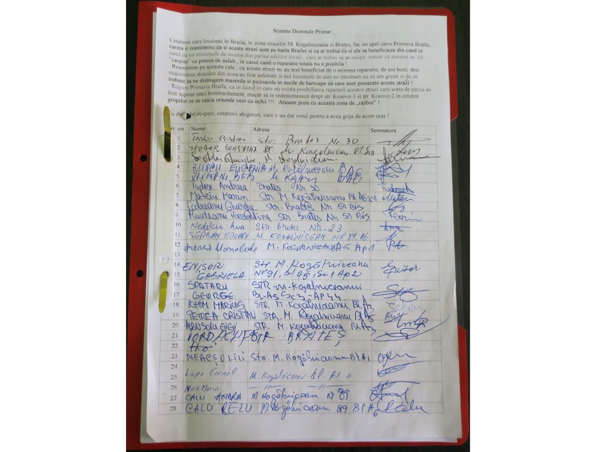 “Cetăţenii care locuiesc în Brăila, în zona străzilor M. Kogălniceanu şi Brateş, fac un apel către Primăria Brăila, căreia îi reamintesc că şi aceste străzi sunt pe harta Brăilei şi că ar trebui ca şi ele să beneficieze din când în când de un minimum de atenţie din partea edililor locali, care ar trebui să se ocupe măcar ca acestea să fie «cârpite» cu petece de asfalt, în cazul în care o reparaţie totală nu e posibilă. Reamintim pe această cale că aceste străzi nu au mai beneficiat de o minimă reparaţie de ani buni, deşi majoritatea străzilor din zonă au fost asfaltate, iar noi, locatarii de aici, ne întrebăm cu ce am greşit şi de ce trebuie să ne distrugem maşinile şi picioarele în zecile de hârtoape cu care sunt presărate aceste străzi! Rugăm Primăria Brăila ca, în cazul în care nu există posibilitatea reparării acestor străzi care arată de parcă au fost supuse unui bombardament, măcar să le redenumească drept Str. Kosovo 1 şi Str. Kosovo 2, în cinstea gropilor ce se cască oriunde vezi cu ochii!!!”, se arată în sesizarea redactată într-un mod sarcastic, conform stării de spirit a celor 67 de semnatari.