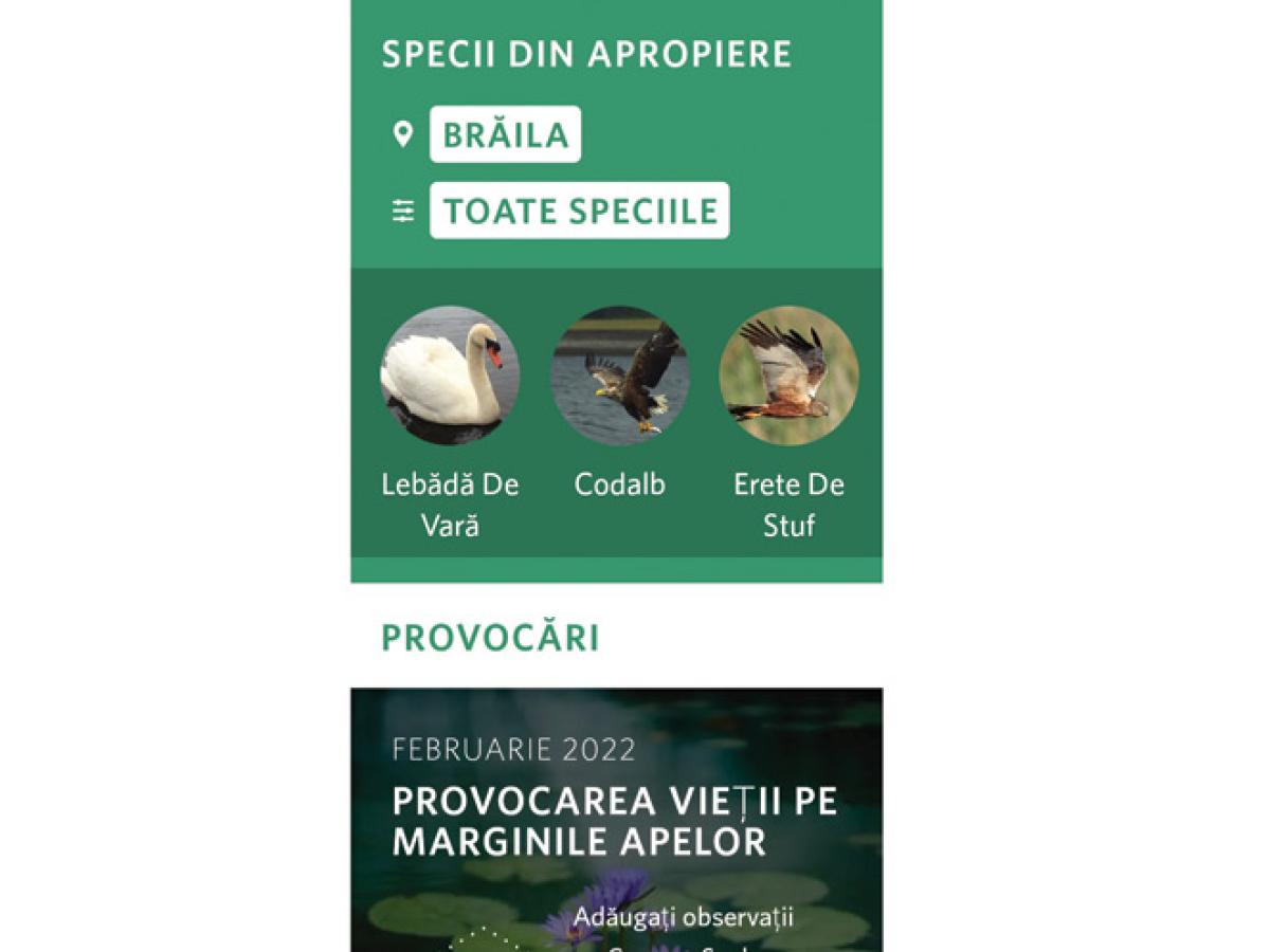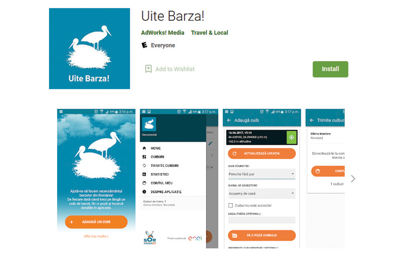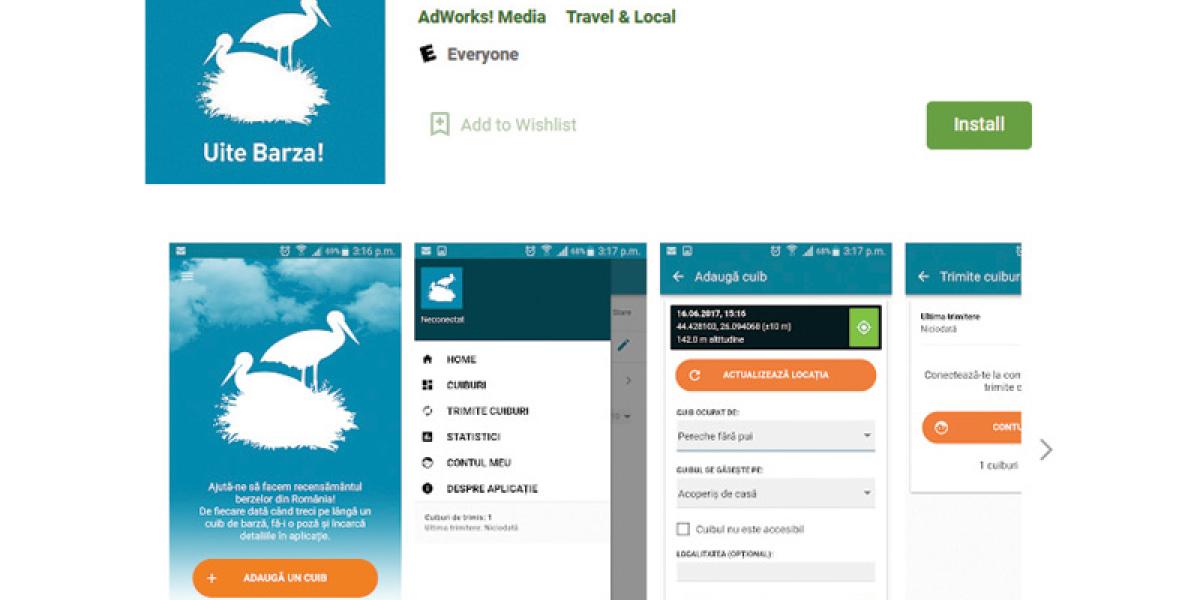 1. Uite barza: această aplicație este folosită de foarte multă lume și ajută la inventarierea cuiburilor de barză de pe teritoriul României. Pe smartphone se poate descărca aplicația Uite barza!, disponibilă atât pentru Android, cât și pentru iOS. Când utilizatorul se află în imediata apropiere a cuibului de barză, trebuie să pornească aplicația și GPS-ul telefonului. După înregistrarea localizării este necesară completarea câtorva informații: număr de păsări prezente la cuib, pe ce fel de construcție se află cuibul și dacă acesta este sau nu în pericol.