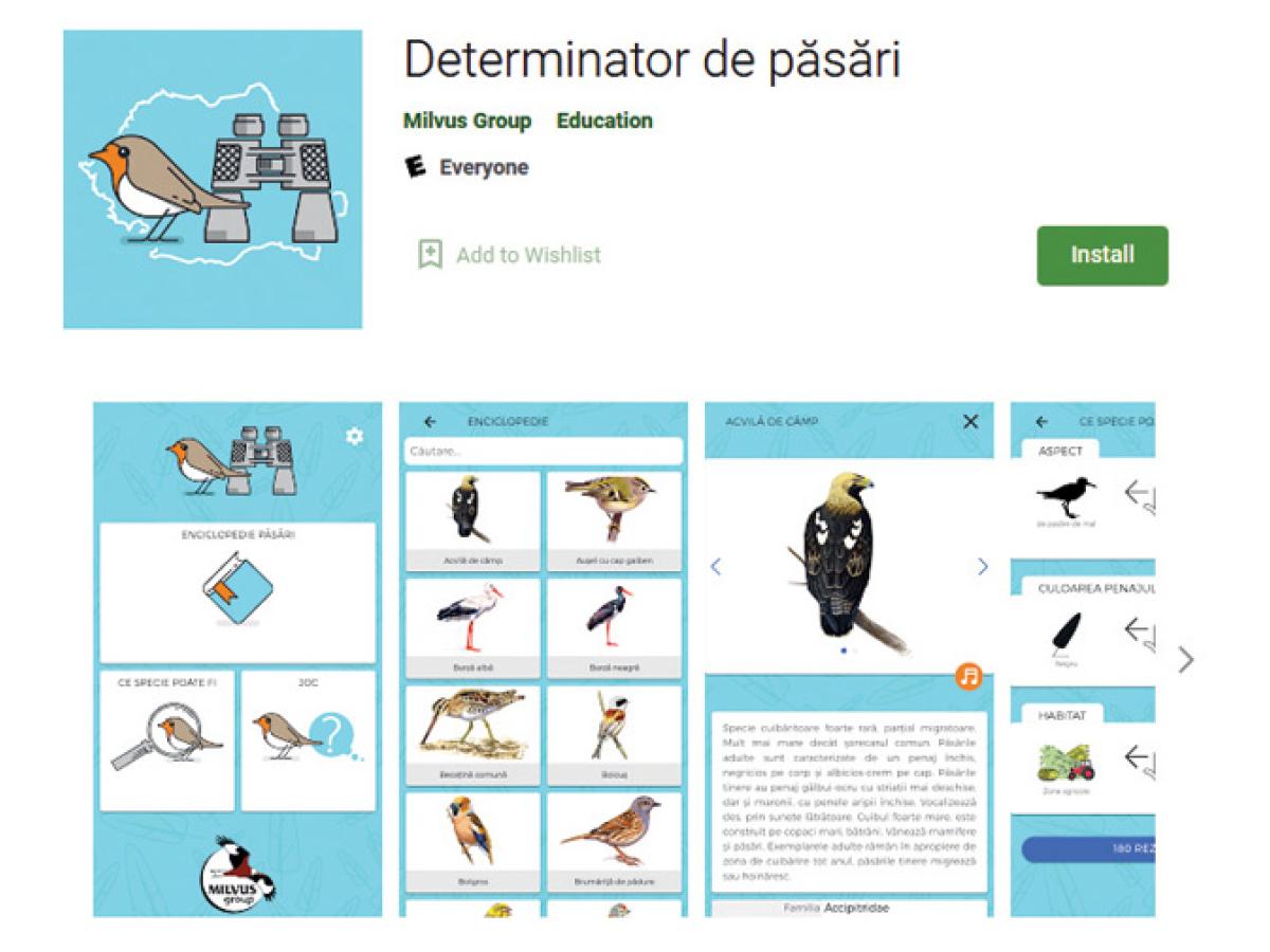 2. Determinator de păsări: este o aplicație a Asociației Milvus și cuprinde una din cele mai importante Enciclopedii de păsări, o rubrică unde putem recunoaște pasărea observată după anumite detalii și un joc unde ne este prezentată o fotografie cu o specie de pasăre și trei denumiri diferite, urmând ca noi să recunoaștem specia.