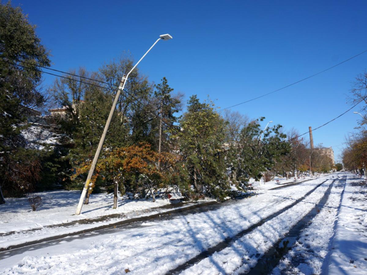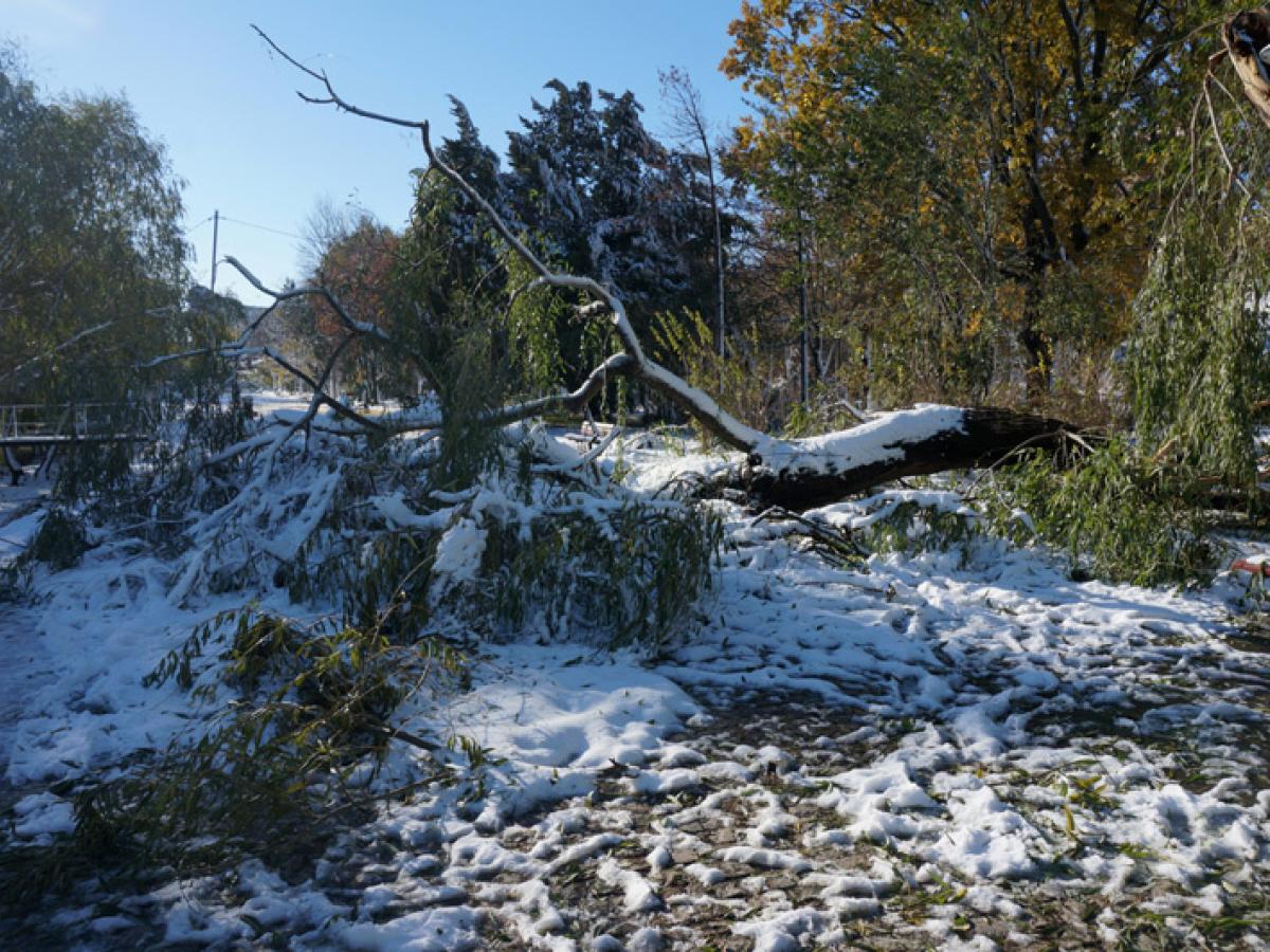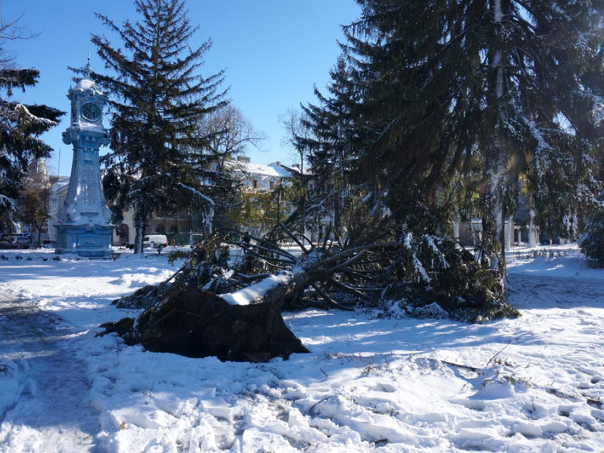 • numărul arborilor doborâți de viscolul de sâmbătă și duminică întrece orice imaginație • Seroplant acționează în teren cu 50 de oameni și numeroase utilaje dar conducerea acestui serviciu din cadrul Primăriei spune că nici până la sfârșitul lunii ianuarie nu vor putea fi înlăturați de pe domeniul public toți copacii căzuți la pământ • în Parcul Monument e un adevărat dezastru