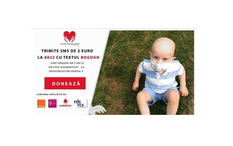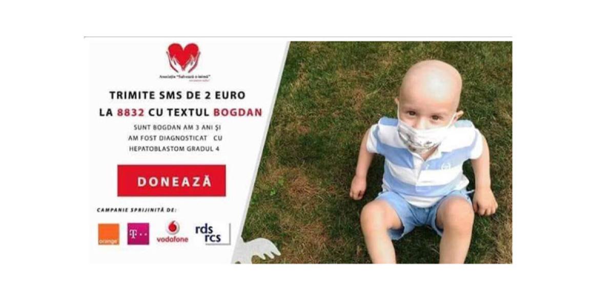 Dar din dar se face rai! Aproape 5.000 de SMS-uri salvatoare şi donaţii de aproape 10.000 euro pentru Bogdi! Iar totul în doar o săptămână! Cu ajutorul numărului scurt 8832 obţinut de Asociaţia “Salvează o inimă”, 4.900 de oameni inimoşi au putut dona până acum câte 2 euro prin SMS pentru băieţelul de numai trei anişori care se luptă cu tumora la ficat. Iar campania continuă până pe 15 septembrie. Haideţi să “rupem” 2 euro, adică mai puţin de 10 lei, pentru acest băieţel minunat! Haideţi să renunţăm pentru o zi la un suc, o îngheţată sau o prăjitură şi să ajutăm un copil aflat în suferinţă! Cei care doresc să-i ofere şansa lui Bogdi de a se face bine cât mai repede urmând tratamentul de care are nevoie pot trimite un mesaj la 8832, cu textul BOGDAN. Campania este sprijinită de Orange, Telekom, Vodafone şi RCS-RDS. Numărul de SMS este valabil în perioada 14 august-15 septembrie 2018. Nu se percepe TVA pentru donaţiile de pe abonament. În reţelele Telekom, Orange şi Digi Mobil, pentru cartelele preplătite, TVA-ul a fost reţinut la achiziţionarea creditului. Pentru utilizatorii cartelei Vodafone, nu se plăteşte TVA.