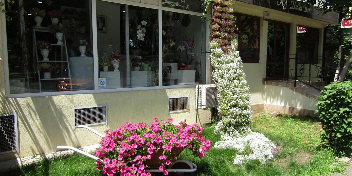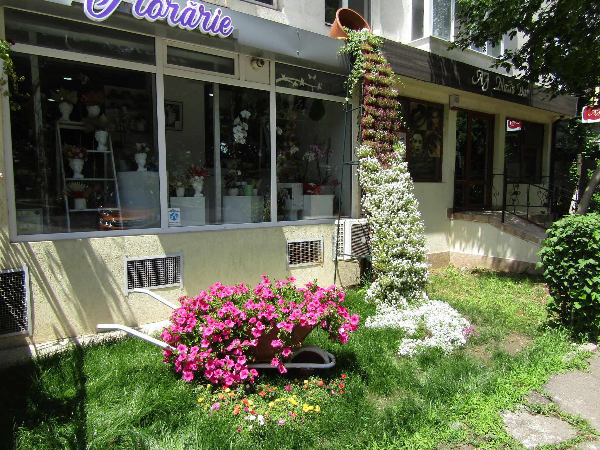 * “Cascada cu flori” şi “Roata grădinarului” amenajate în dreptul unei florării de pe bulevardul Independenței oferă un plus de frumusețe zonei * vestea bună e că și prin alte zone ale orașului au apărut astfel de inițiative, din partea unor persoane fizice, societăți comerciale sau asociații de proprietari