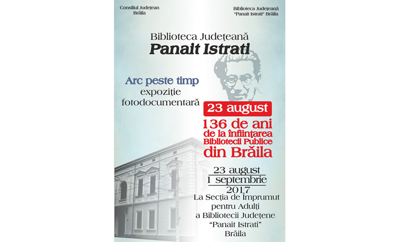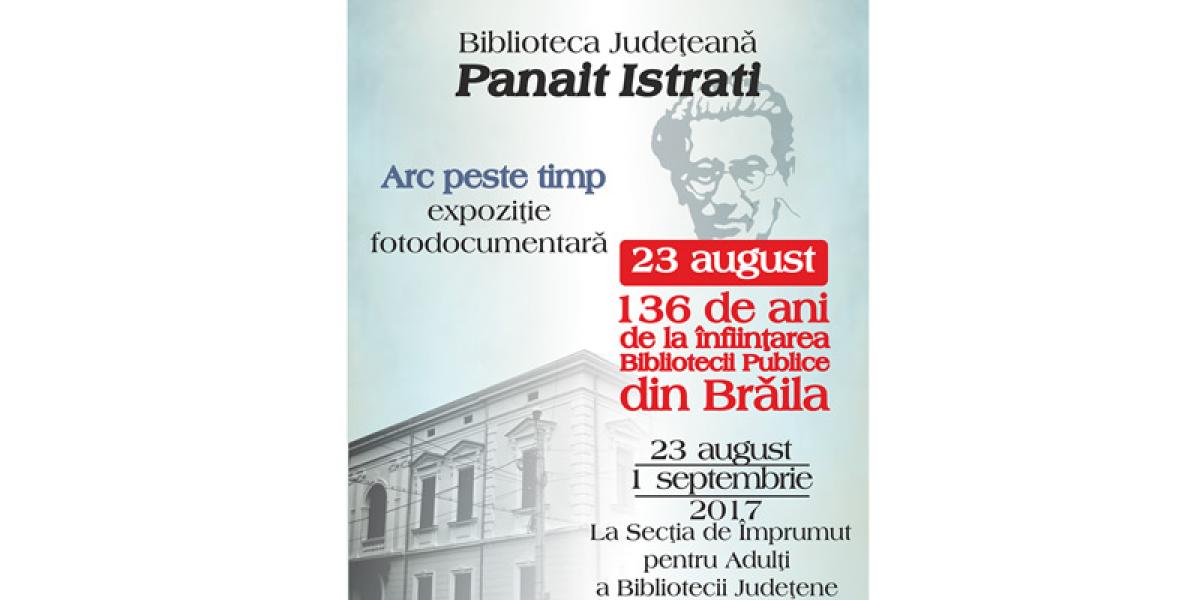 Biblioteca Judeţeană “Panait Istrati” Brăila marchează 136 de ani de la înfiinţare prin expoziţia foto-documentară “Arc peste timp”, realizată de bibliotecar Doina Lalu şi care poate fi vizitată în perioada 24 august – 1 septembrie 2017.
