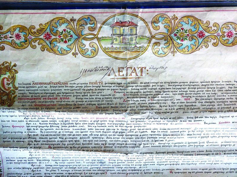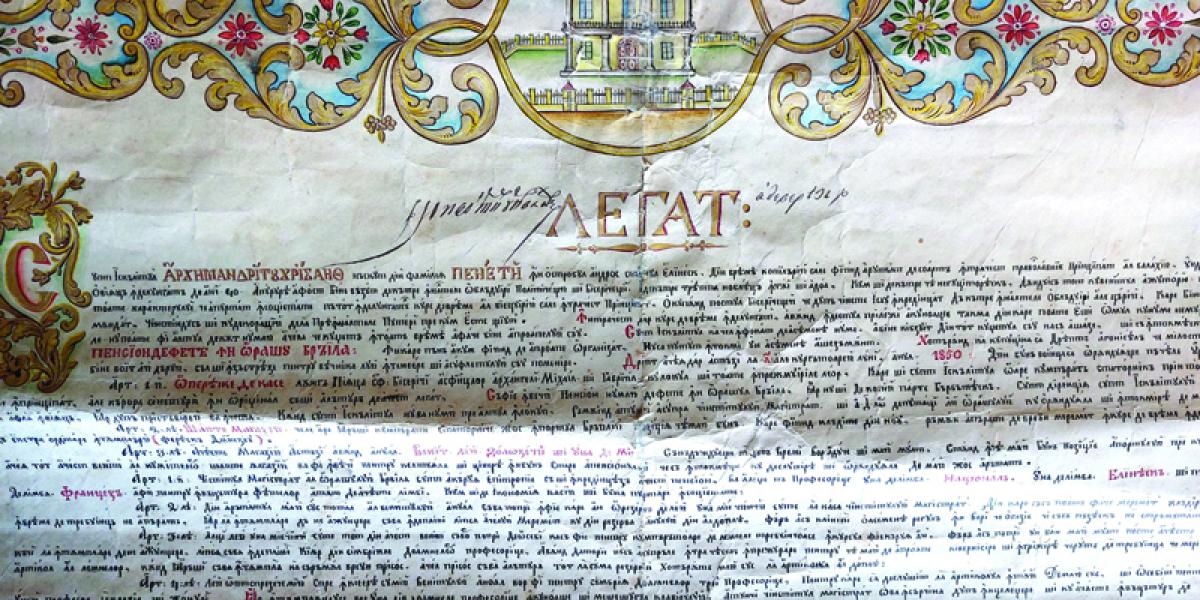 Scris cu caractere chirilice și ornat cu aur lichid, Legatul (testamentul) părintelui Arhimandrit Hrisant Penetis este datat 1 ianuarie 1850 și a fost întocmit cu binecuvântarea Mitropolitului Țării. Are aproape un metru lungime și este păstrat într-o casetă metalică. Unic în această parte a țării, Legatul a fost donat de către profesorul Țane, pe vremea lui Ceaușescu, împreună cu alte 55 de documente valoroase și nu a fost expus niciodată. Potrivit neobositului arhivist Ștefania Botez, consilier în cadrul SJAN Brăila, documentul are 85x60 cm, este încadrat de un chenar floral de aur și poartă sigiliu turnat în ceară roșie, specific doar domnitorilor și autorităților eclesiastice ale vremii. Este mare lucru să ții în mâini acest artefact vechi de mai bine de un secol și jumătate!