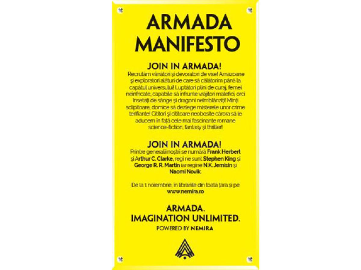 Nemira a lansat pe 15 octombrie un nou proiect editorial: ARMADA, un imprint dedicat literaturii science fiction, fantasy şi thriller. Armada va oferi cititorilor în fiecare lună cele mai noi cărţi de science fiction, fantasy şi thriller în ton cu piaţa de carte internaţională, dar şi autori consacraţi mereu actuali pentru noile generaţii de cititori în colecţia Armada Clasic. Cărţile vor avea un design nou, comercial, fresh şi atractiv.