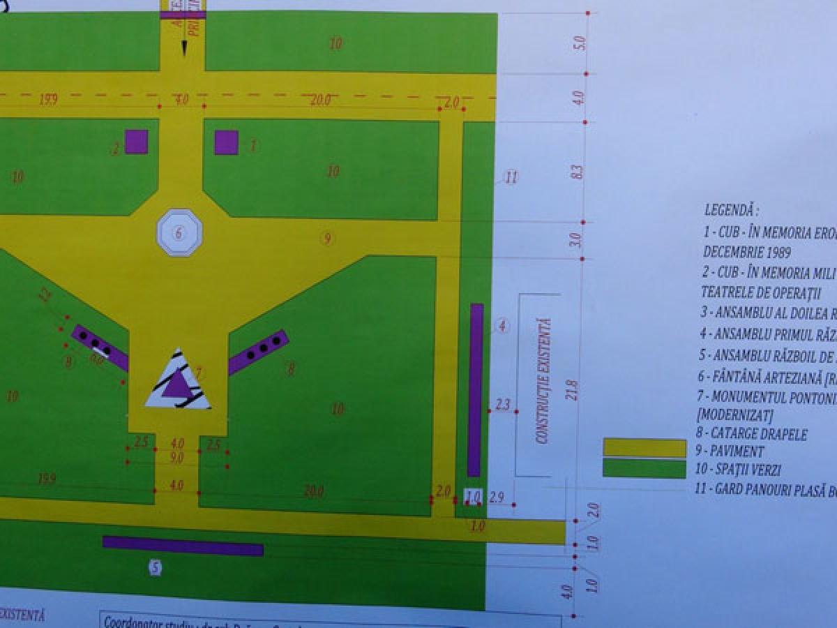 • este vorba despre un ansamblu comemorativ în care vor fi postate busturile unor mari personalităţi din timpul Războiului de Independenţă şi a celor două războaie mondiale din secolul trecut • statuile vor fi puse pe marginea unor alei dotate cu bănci şi stâlpi de iluminat, iar în centrul ansablului se va afla o fântână arteziană • micul parc este situat în incinta cazărmii de pe Calea Călăraşilor şi, după ce va fi finalizat, va fi accesibil tuturor brăilenilor • totul ar trebui să fie gata până în 2018, când se împlinesc 650 de ani de la prima atestare documentară a Brăilei • ieri, s-au inaugurat oficial lucrările, în cadrul unor evenimente prilejuite de apropiata Zi a Armatei României, care se va serba pe 25 octombrie