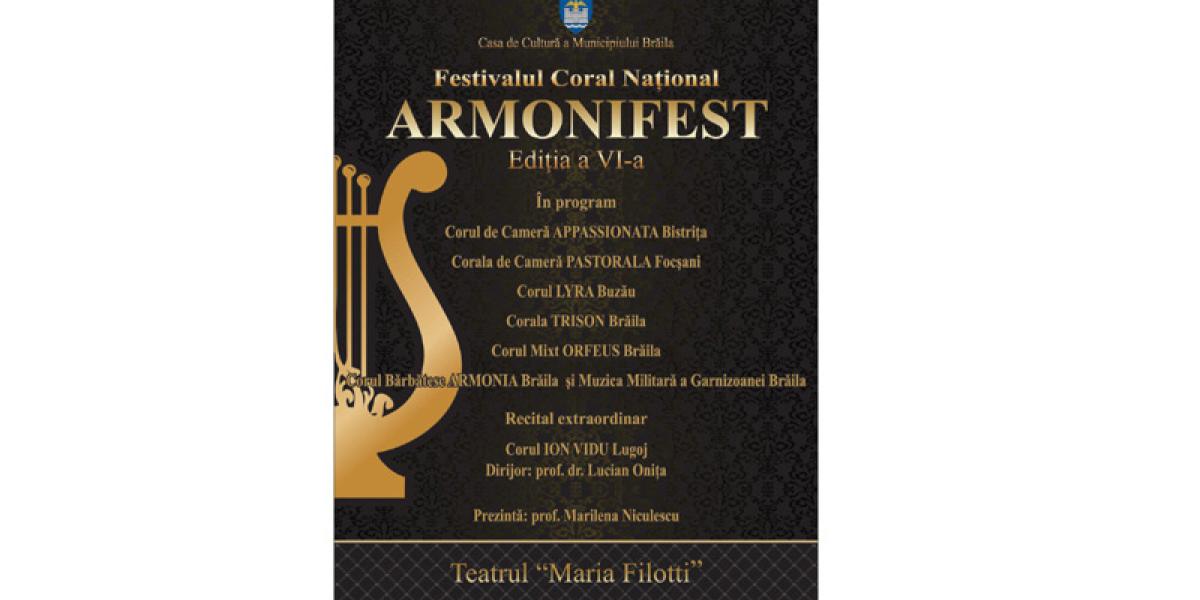 Duminică, 17 noiembrie 2019, începând cu ora 17.00, la Teatrul “Maria Filotti” se va desfăşura cea de a şasea ediţie a Festivalului Coral ARMONIFEST, manifestare organizată de Casa de Cultură a Municipiului Brăila, cu sprijinul Primăriei Municipiului Brăila.