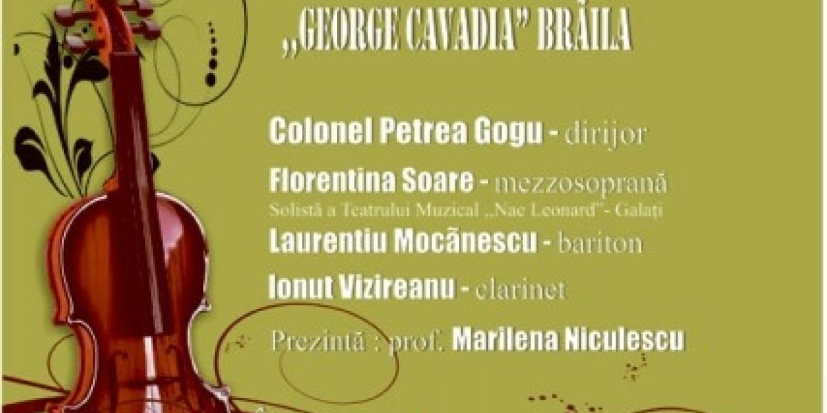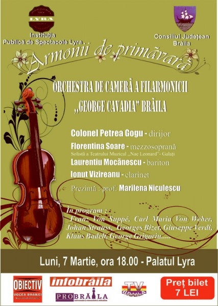Luni, 7 martie, de la orele 18.00, sala de concerte a Societăţii Filarmonice Lyra găzduieşte concertul "Armonii de Primăvară" al Orchestrei de Cameră a Filarmonicii "George Cavadia" Brăila, sub bagheta dirijorului colonel Petrea Gogu. În spectacol vor evolua mezzosoprana Florentina Soare, baritonul Laurenţiu Mocănescu şi clarinetistul Ionuţ Vizireanu, iar în program vor fi lucrări de Franz Von Suppe, Carl Maria Von Weber, Johan Strauss, Georges Bizet, Giuseppe Verdi.