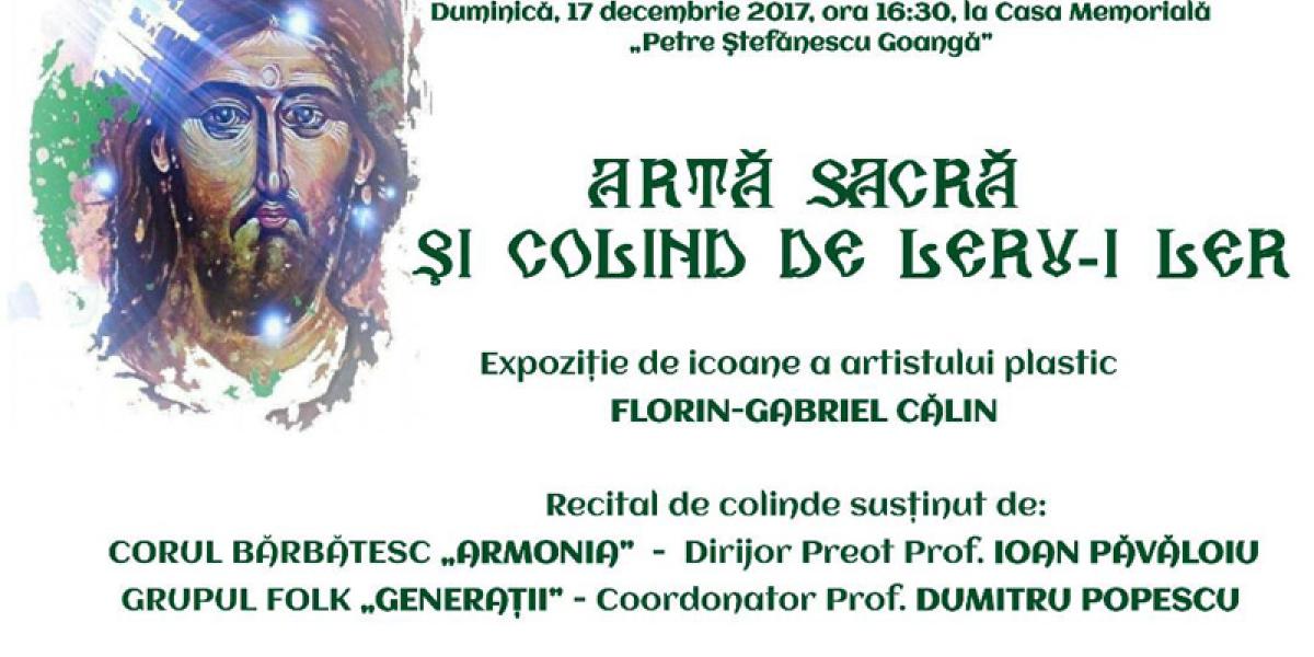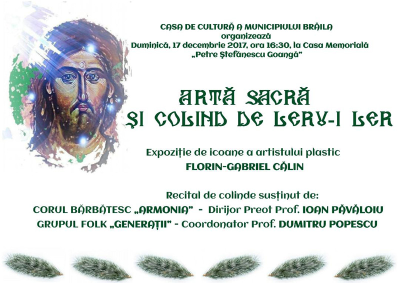 Casa de Cultură a Municipiului Brăila organizează duminică, 17 decembrie 2017, la Casa Memorială Petre Ştefănescu-Goangă, o manifestare sugestiv intitulată “Artă sacră şi colind de leru-i ler”, un eveniment la care sunt invitaţi toţi cei care doresc să întâmpine împreună marea sărbătoare a Naşterii Domnului.