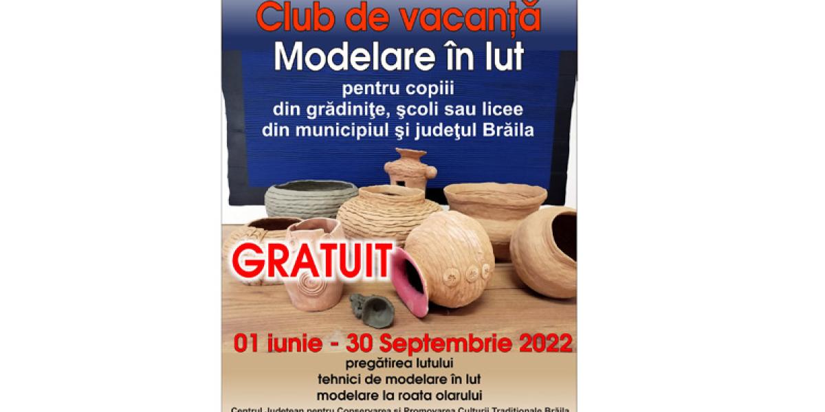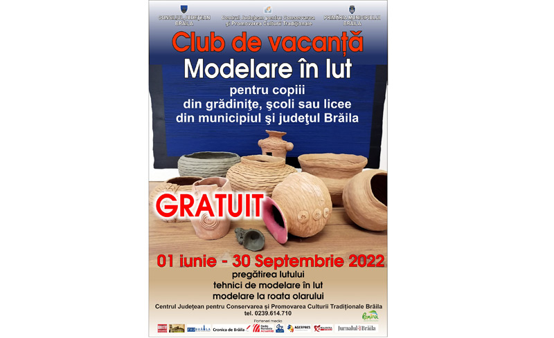 Club de vacanță la Centrul de Creație Brăila. Centrul Județean pentru Conservarea și Protejarea Culturii Tradiționale Brăila (Centrul de Creație), cu sprijinul Consiliului Județean și al Primăriei Municipiului Brăila organizează, gratuit, în perioada 1 iunie - 30 septembrie 2022, clubul de vacanță „Modelare în lut”, la care se pot înscrie copiii de la grădinițele, școlile și liceele din municipiu și județ. Activitățile desfășurate în cadrul clubului de vacanță constau în pregătirea lutului, însușirea tehnicilor de modelare în lut, precum și în modelarea lutului la vestita roată a olarului.