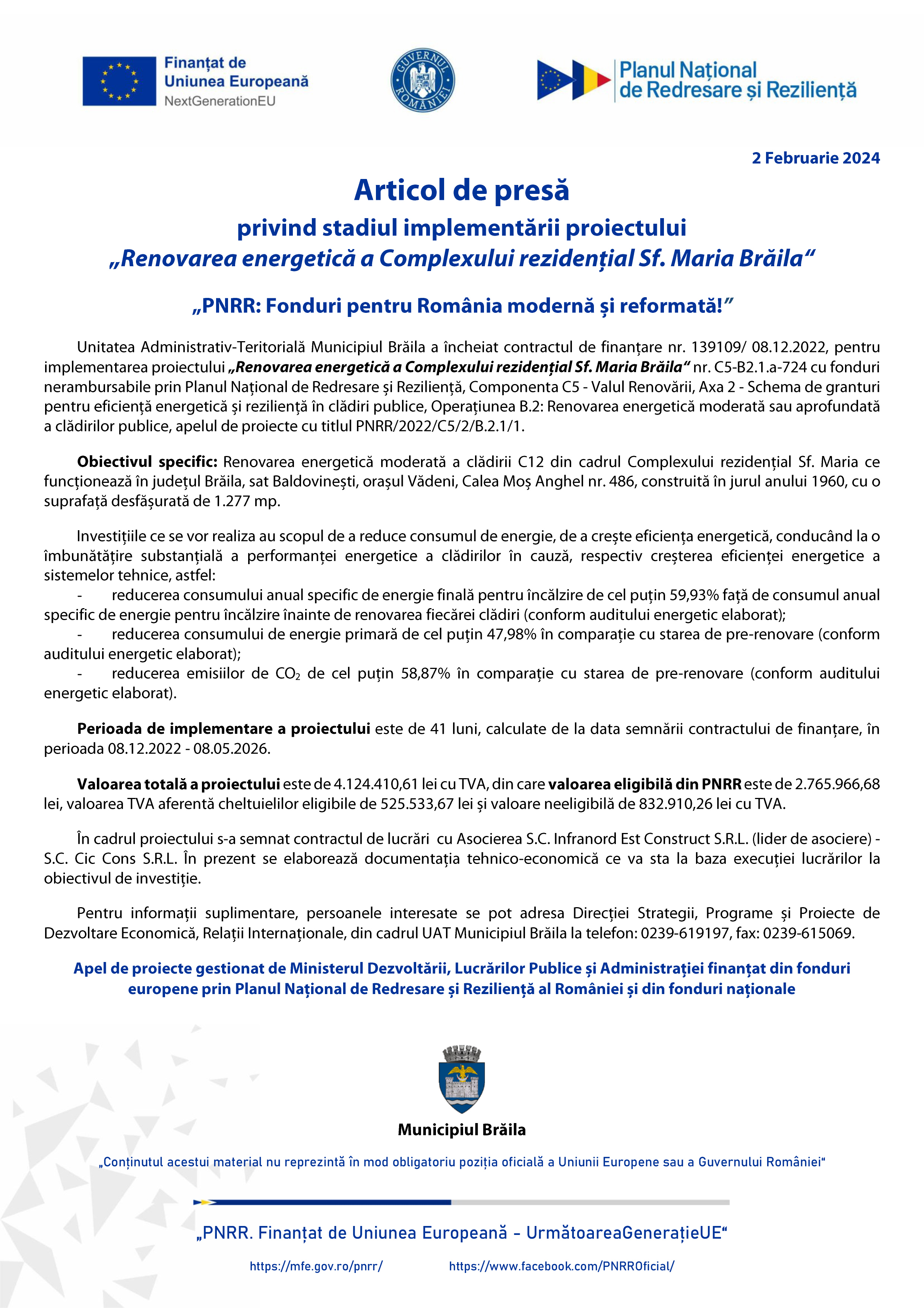 Articol de presă privind stadiul implementării proiectului "Renovarea energetică a Complexului rezidenţial Sf. Maria Brăila" "PNRR: Fonduri pentru România modernă şi reformată!"
