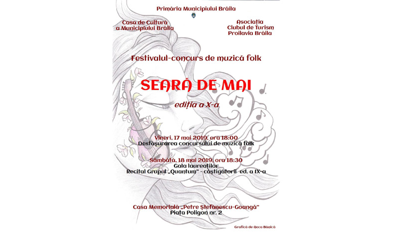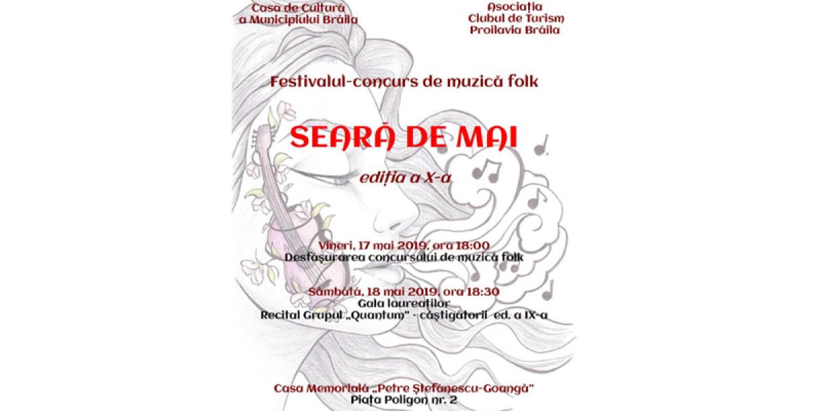 Casa de Cultură a Municipiului Brăila, în parteneriat cu Asociaţia Clubul de Turism “Proilavia” Brăila, organizează astăzi, 17 mai 2019, cea de a X-a ediţie a Festivalului Concurs de Muzică Folk “Seară de Mai”. Ediţia din acest an, ca şi precedenta, se va desfăşura în aer liber, în curtea imobilului din strada Oituz nr.5 - fosta casă a armatorului grec Ianis Matukis, din Piaţa Poligon, începând cu ora 18:00. Manifestarea reuneşte tineri din Brăila, care doresc să-şi afirme potenţialul artistic în domeniul creaţiei şi interpretării muzicii folk.
