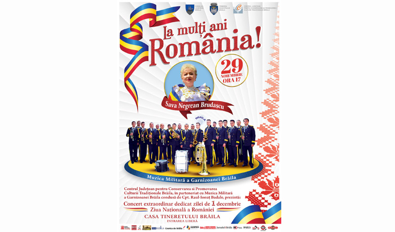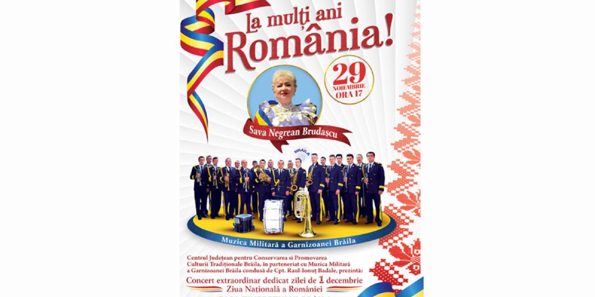 Sub genericul „La mulți ani, România!”, astăzi, de la ora 17.00, are loc, la Casa Tineretului, de pe Calea Călărașilor, Concertul extraordinar dedicat Zilei de 1 Decembrie - Ziua Națională a României - susținut de cunoscuta interpretă de muzică populară Sava Negrean Brudașcu, secondată de Muzica Militară a Garnizoanei Brăila, condusă de căpitan Raul-Ionuț Badale.