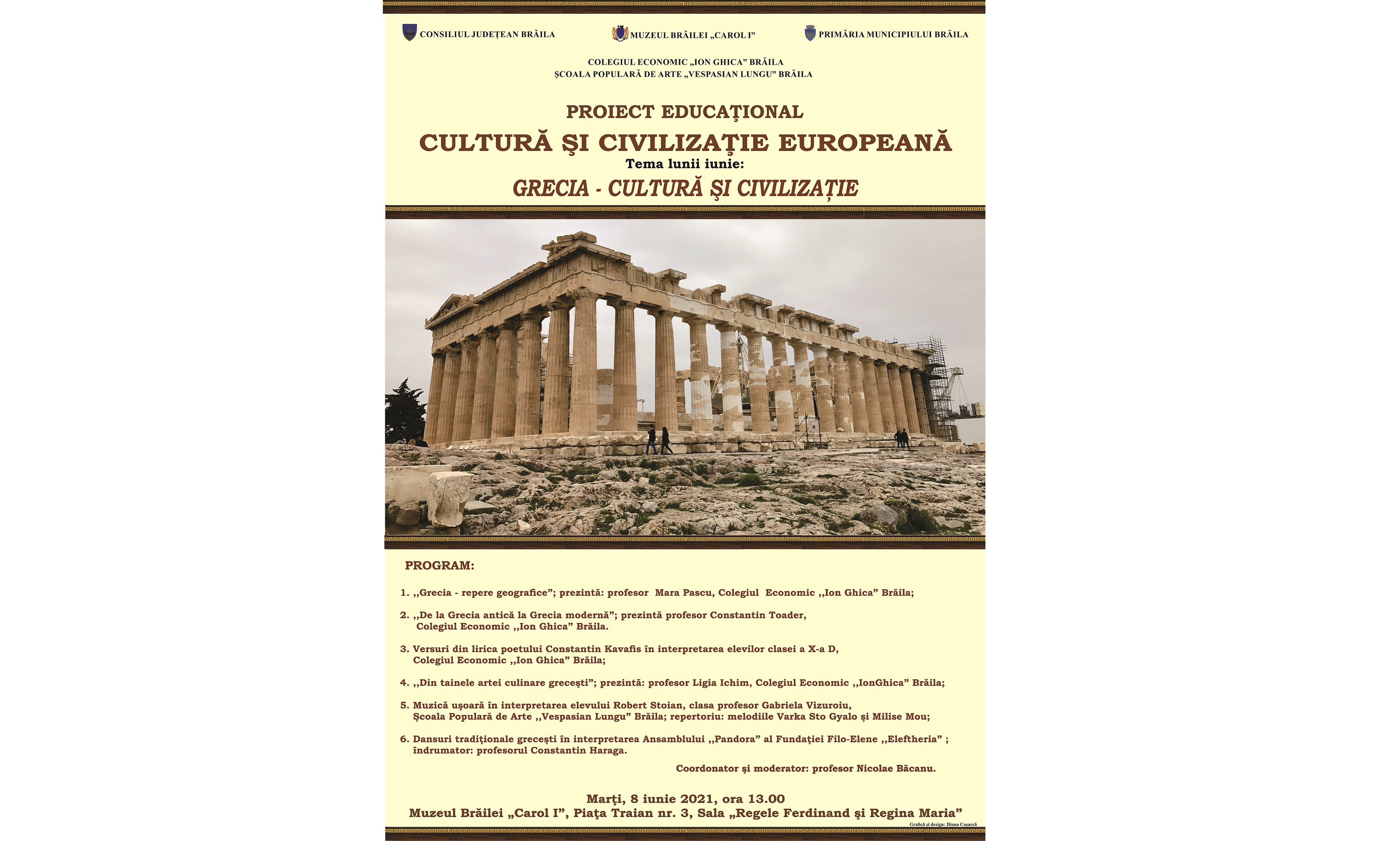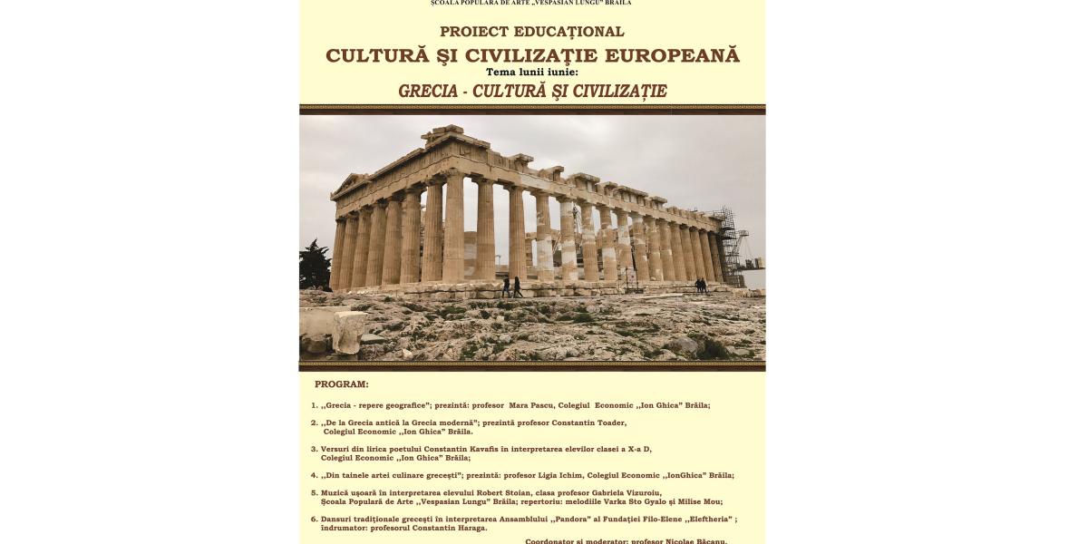 Potrivit unui comunicat dat publicității de instituția de cultură, în ziua de marți, 8 iunie, începând cu ora 13.00, are loc, în Sala "Regele Ferdinand și Regina Maria" din Piața Traian nr. 3, o nouă etapă a proiectului educațional "Cultură și civilizație europeană", organizat de Colegiul Economic "Ion Ghica" în colaborare cu Școala Populară de Arte "Vespasian Lungu" Brăila și Muzeul Brăilei "Carol I". Tema acestei noi etape a proiectului este: "Grecia - cultură și civilizație".