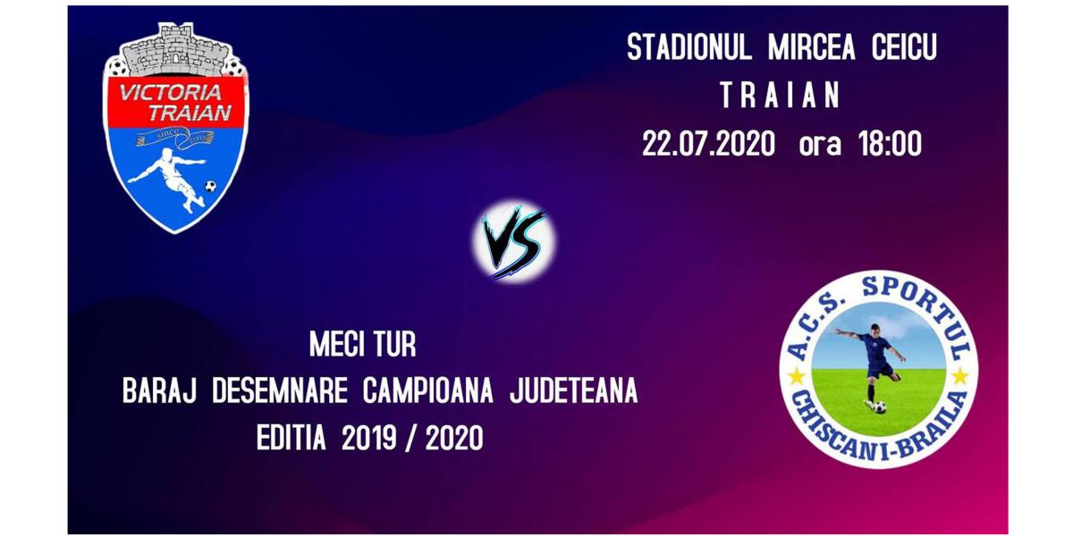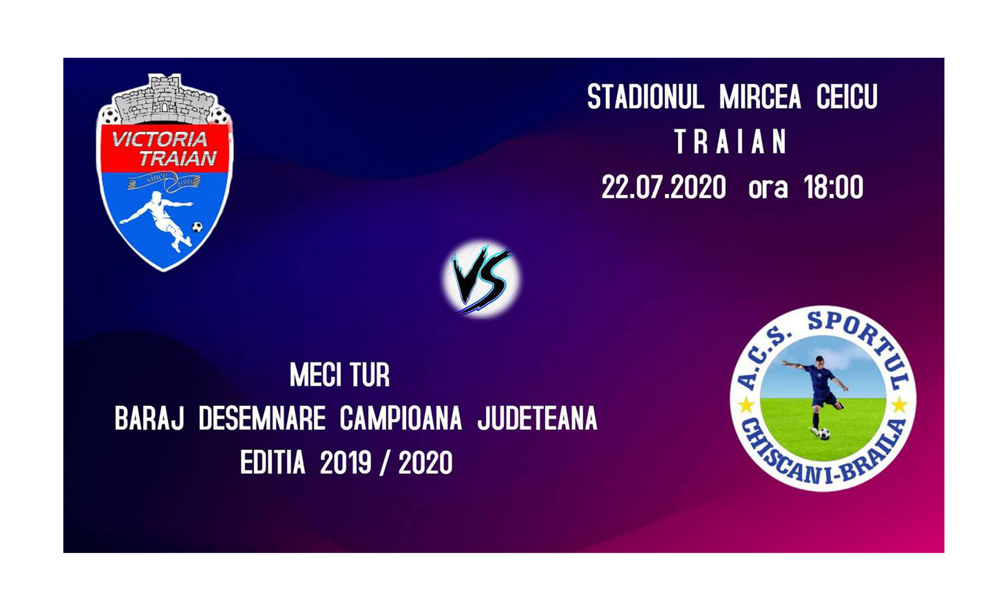Astăzi, de la ora 18.00, la Traian se dispută meciul tur din dubla manşă, dintre Victoria Traian şi Sportul Chiscani, programat de Asociaţia Judeţeană de Fotbal Brăila (AJF) pentru desemnarea campioanei Ligii a IV-a. Şi un alt aspect foarte important, pe care organizatoarea Ligii a IV-a, AJF Brăila, doreşte să-l facă cunoscut este că: “Meciurile dublei manşe dintre Vitoria Traian şi Sportul Chiscani, se dispută fără spectatori”.