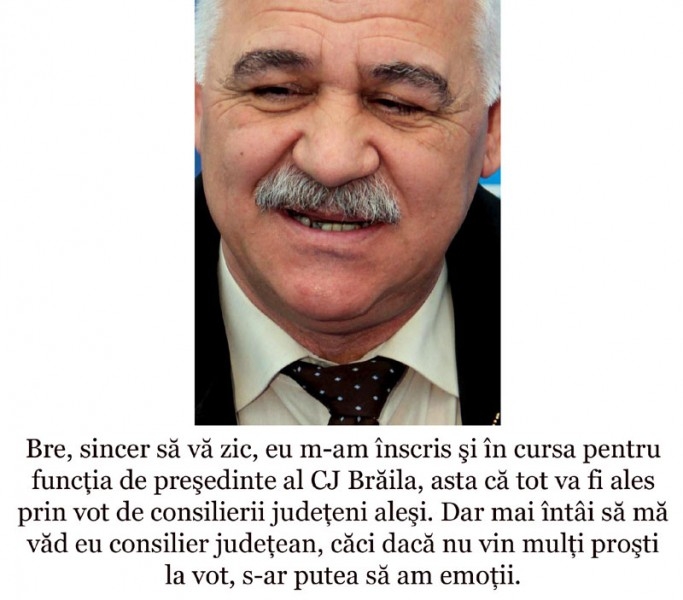 În loc să se ascundă la 100 de metri sub pământ, să nu mai auzim în vecii vecilor, Amin de persoana lui, Gheorghi Obreja iese în faţă cu tupeu, sanchi, pentru a reprezenta interesele cetăţenilor. Vorbim despre acelaşi Obreja care a simulat o detaşare în comuna Târlungeni, din judeţul Braşov, pentru a putea obţine statutul de funcţionar public, statut care îi era necesar la numirea în funcţia de prefect al Brăilei. Fraţilor, voi auziţi ce vorbim noi aici? Un nimeni ca Obreja a ajuns să fie ditamai prefectul Brăilei, iar noi, societatea civilă, am stat şi am suportat o asemenea umilinţă. Bun, poate că o să ziceţi că societatea civilă (atâta câtă mai este ea în Brăila) nu putea face nimic pentru a se opune numirii lui Obreja în postul de prefect, ceea ce este corect. Dar, şi subliniez acest DAR, societatea civilă, cetăţenii la urma-urmei, pot face acum un lucru mare, în ceea ce îl priveşte pe Obreja, şi anume să refuze să voteze lista pe care se va afla acesta. Nu contează că este pe prima poziţie sau pe poziţia a paişpea: dacă Obreja apare pe acea listă, indiferent ce partid va propune lista cu pricina, brăilenii să refuze să o voteze (lista). Să piardă în primul rând partidul care l-a propus cu nesimţire pe Gheorghi Obreja şi abia mai apoi să sufere şi Obreja pentru că, deh, nu a mai prins loc în CJ Brăila.