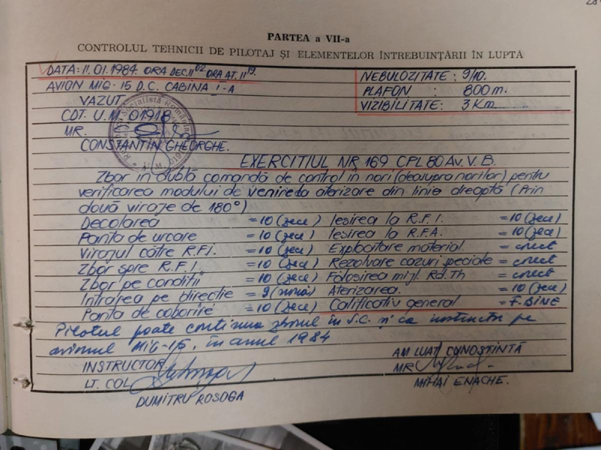„Tata era făcut să fie pilot! A zburat pe IAR-99, pe L-29, L-39, dar viața lui a fost MIG - 15. A avut la activ peste 2.000 de ore de zbor. Din anul 1969, de când a început „pendularea între cer și pământ”, a zburat doar pe Ianca, venit ca pilot de luptă la Regimentul 49 Aviație Vânătoare - Bombardament, unde i-a găsit „pe șoimii ce au zburat pentru prima oară cu un avion cu reacție în România: Suciu, Tincu, Dee, Gârbaciu, Crăciun, ce au făcut parte din mentorii lui, în desăvârșirea sa ca pilot” (volumul „Promoția 1969 de piloți militari a Școlii Superioare de ofițeri de aviație Aurel Vlaicu”, general de flotilă aeriană (r.) Aurel Stan). Zborul îl relaxa, era destins, dar, în același timp, riguros și ferm. În cartea amintită anterior, i se face tatălui meu următoarea descriere: „Foarte încrezător, creativ și competitiv, și-a cucerit destul de repede o poziție dominantă în ierarhia profesională a „nebunilor” de pe aerodromul din nordul Bărăganului. Era capabil să proceseze simultan amenințările inerente misiunilor de zbor, informațiile vizuale și tactile, să prioritizeze rapid acțiunile și să rămână permanent și complet în controlul aeronavei... a fost cel mai experimentat pilot din România pe acest tip de avion - MIG - 15”.