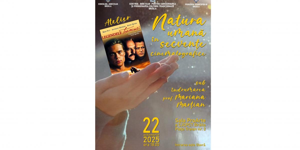 Consiliul Județean Brăila şi Centrul Județean pentru Conservarea și Promovarea Culturii Tradiționale (Centrul de Creație), cu sprijinul Primăriei Municipiului Brăila, îi invită pe brăileni miercuri, 22 octombrie, ora 18:00, la atelierul cultural bilunar intitulat „Natura umană în secvențe cinematografice”, care se derulează sub îndrumarea doamnei profesoare Mariana Marțian.