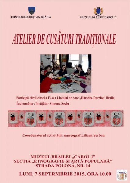 Secţia "Etnografie şi Artă Populară" a Muzeului Brăilei "Carol I", din strada Polonă, nr. 14, organizează luni, 7 septembrie 2015, ora 10, un atelier de cusături tradiţionale. Evenimentul este organizat în colaborare cu Liceul de Arte "Hariclea Darcleé" Brăila şi participă elevii clasei a IV-a, sub îndrumarea învăţătoarei Simona Seciu.