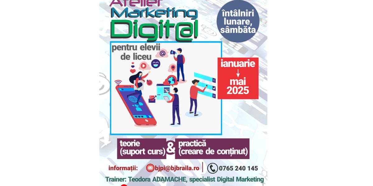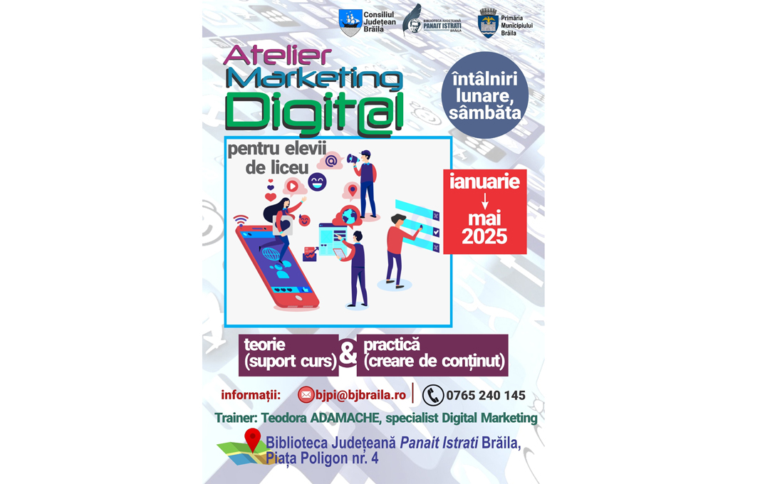 Înscrierile se fac accesând următorul link: https://forms.gle/5HuHuD2RoFmk2QLy9. Informații despre Atelierul de Marketing Digital pot fi solicitate la tel. 0765.240.145 sau la emailul: bjpi@bjbraila.ro.