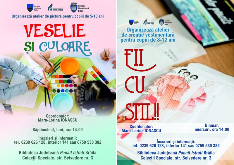 Biblioteca Județeană ”Panait Istrati” vine cu recomandări noi pentru părinții care caută activități recreativ-educative pentru copiii lor. Astfel, în perioada următoare, Biblioteca organizează pentru cei mici cursul de pictură "Veselie și Culoare" și atelierul de creație vestimentară "Fii cu stil".