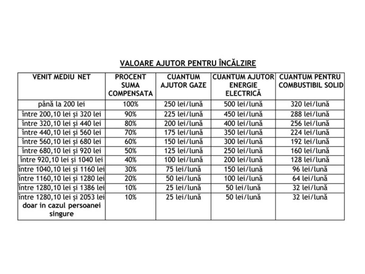Potrivit unui comunicat al instituției, venitul maxim până la care se poate beneficia de subvenție/supliment este până la 1.386 lei/membru de familie, respectiv 2.053 lei pentru persoana singură.
