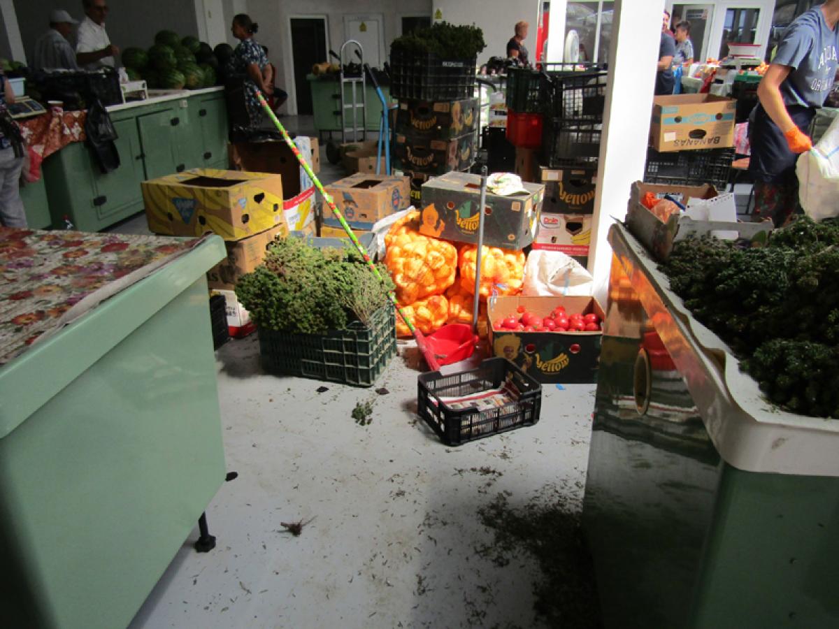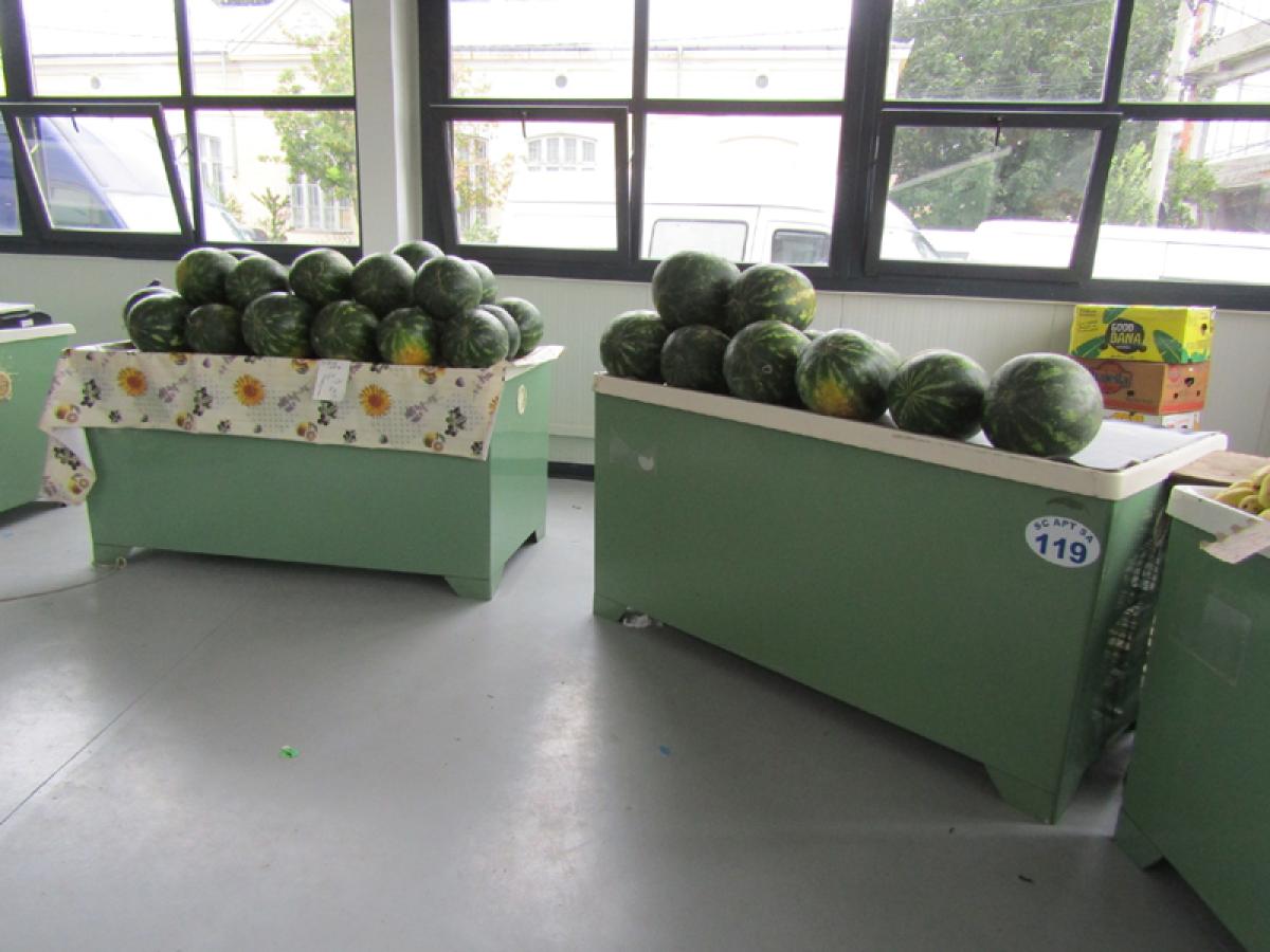 Dacă e să ne referim la spaţiul de trecere, acesta este diminuat din cauza tarabelor aşezate în careu, pentru depozitarea acolo, de-a valma, a mărfurilor nesortate. Iar de aici încolo intrăm în domeniul “una scriem şi alta facem, sau nu respectăm ce s-a stabilit”. Concret, pe uşi scrie că este interzisă vinderea în hala destinată ”producătorilor” a fructelor şi pepenilor (mărfuri care ar trebui vândute doar în Sectorul Fructe, și el renovat recent). De asemenea, la tarabă ar trebui să se vină doar cu produse gata sortate și curate. Numai că aceste reguli sunt departe de a fi respectate: marfa se sortează la fața locului și mult nu mai este până când cișmeaua din hală va fi folosită pentru spălarea legumelor... Multe tarabe sunt pline cu fructe, iar grămezile de pepeni sunt și ele o prezență constantă în acest spațiu abia renovat. Inclusiv comercianți de flori și-au găsit un loc aici, deși în Piața Mare au și ei un alt spațiu special rezervat. Cât despre casele de marcat, nu vezi una în toată hala, cum nu vezi în toată piața de altfel... Deci, este greu şi cu dezvăţul celor care vindeau “de toate pentru toţi” în acelaşi spaţiu, iar acum nu acceptă noile reguli impuse, firesc, de către autorităţile locale. Mai grav este că unii dintre cei care au manevrat platformele cu marfă, cel mai probabil cu pepeni, au avariat deja ușile noi ale halei, fără a păstra ce s-a realizat cu o cheltuială serioasă.