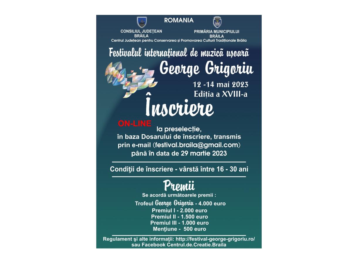Start pentru înscrieri la preselecțiile Festivalului Internațional de Muzică Ușoară „George Grigoriu”, ediția XVIII-a, Brăila, 2023, la care pot participa tineri cu vârsta cuprinsă între 16 și 30 de ani împliniți până la data Galei evenimentului și care vor trimite materialele necesare până la data de 29 martie 2023, la adresa de email festival.braila@gmail.com. Evenimentul este organizat de Centrul Județean pentru Conservarea și Promovarea Culturii Tradiționale Brăila (Centrul de Creație), cu sprijinul Consiliului Județean și al Primăriei Municipiului Brăila. Festivalul „George Grigoriu”, care se va desfășura în perioada 12-14 mai 2023, le oferă câștigătorilor de anul acesta următoarele premii: Trofeul „George Grigoriu” - 4.000 de euro, Premiul I - 2.000 de euro, Premiul II - 1.500 de euro, Premiul III - 1.000 de euro și Mențiune - 500 de euro.