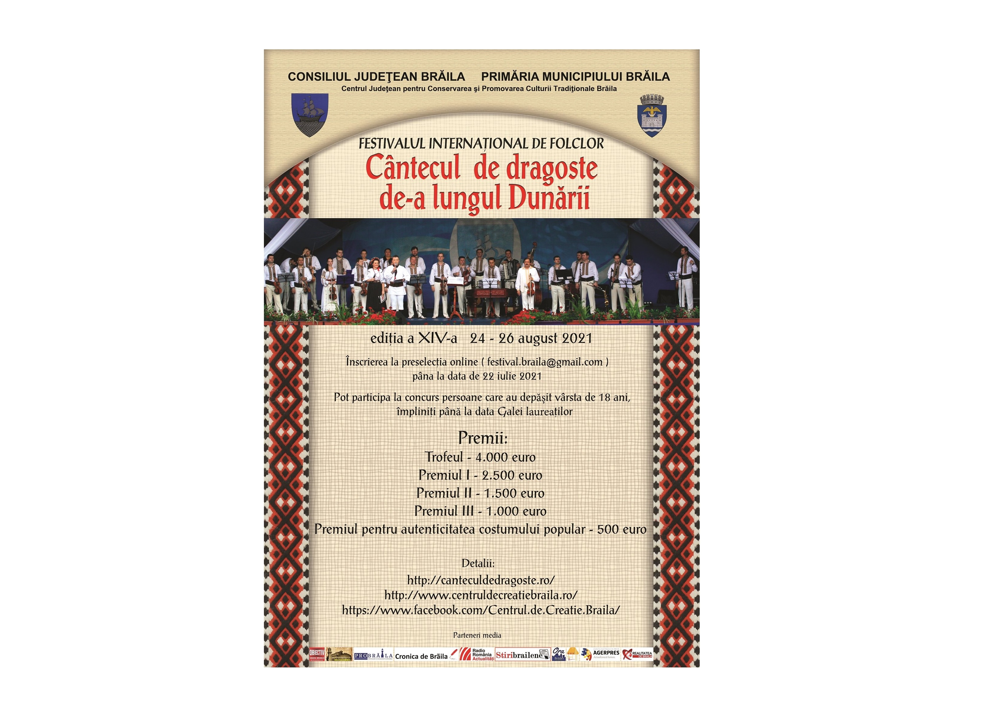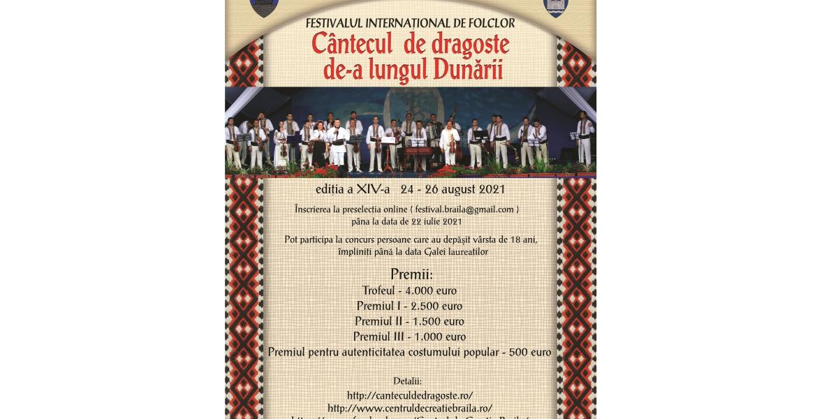 Consiliul Judeţean Brăila şi Centrul Judeţean pentru Conservarea şi Promovarea Culturii Tradiţionale (Centrul de Creaţie) au dat publicităţii Regulamentul celei de-a XIV-a Ediţii a Festivalului Internaţional de Folclor "Cântecul de dragoste de-a lungul Dunării", care se va desfăşura la Brăila, în perioada 24-26 august 2021.